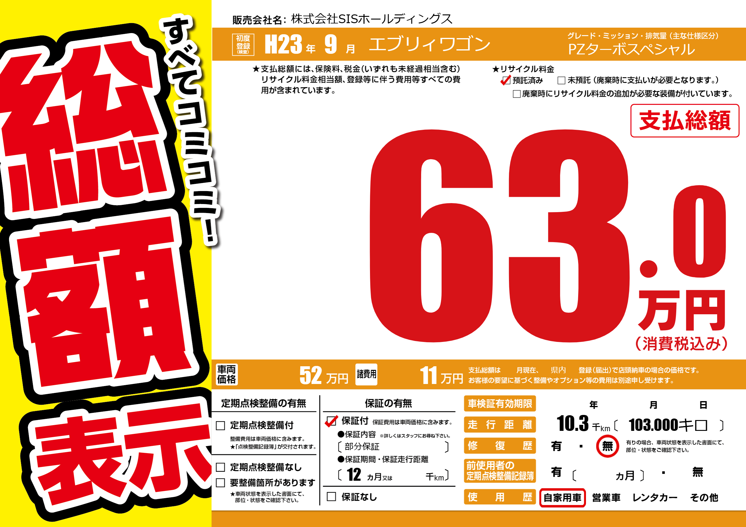 | 車名 | エブリィワゴン | グレード ミッション 排気量 |