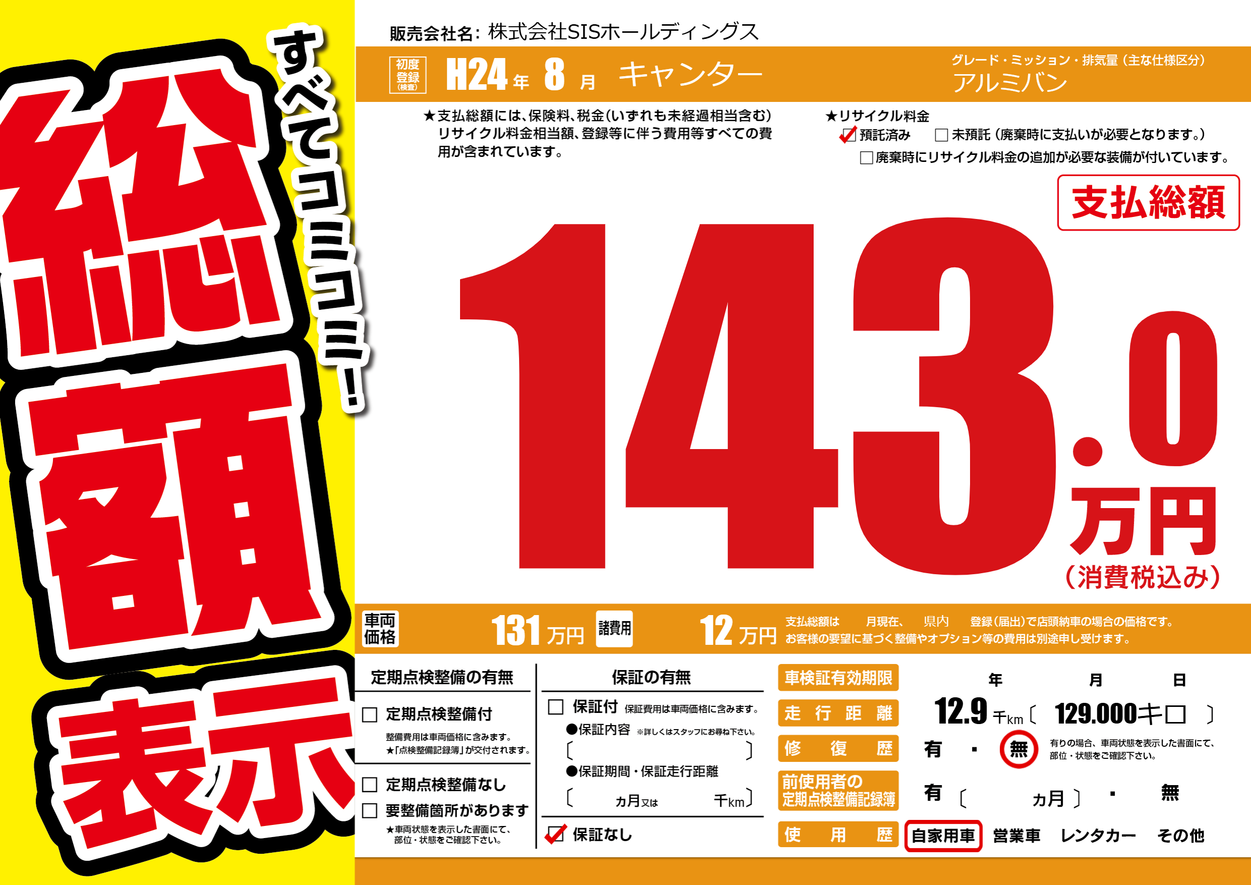 あり | リサイクル預託金相当額 | ( 0円)が別途必要 |