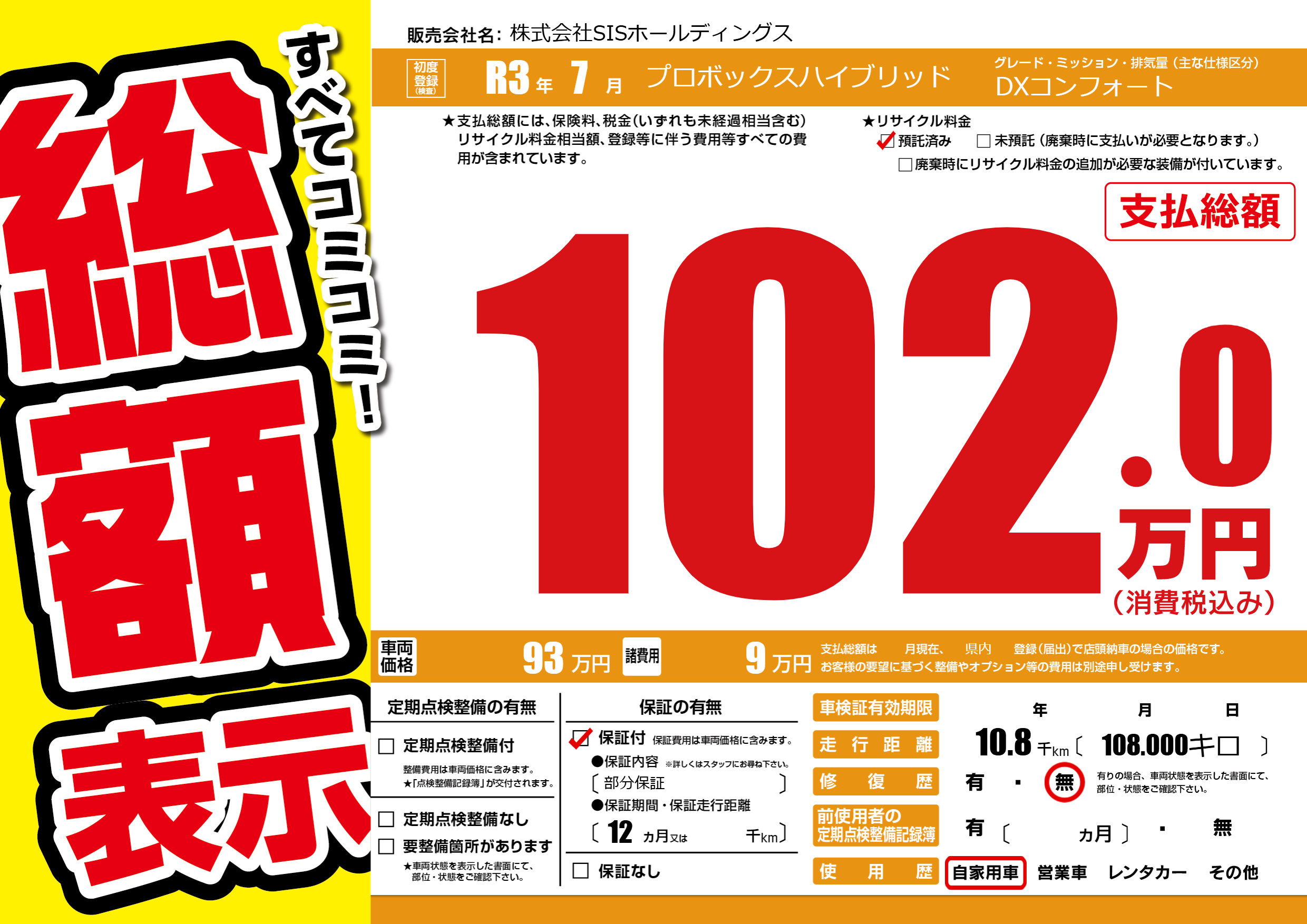 | 車名 | プロボックスハイブリッド | グレード ミッション 排気量 |