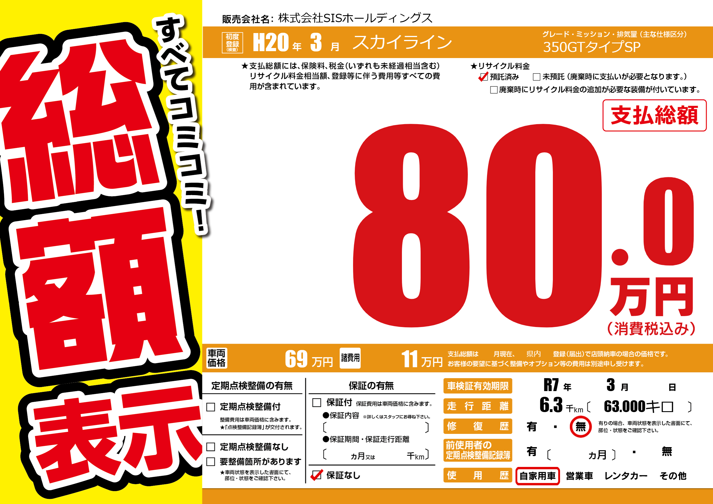 | 車名 | スカイライン | グレード ミッション 排気量 |