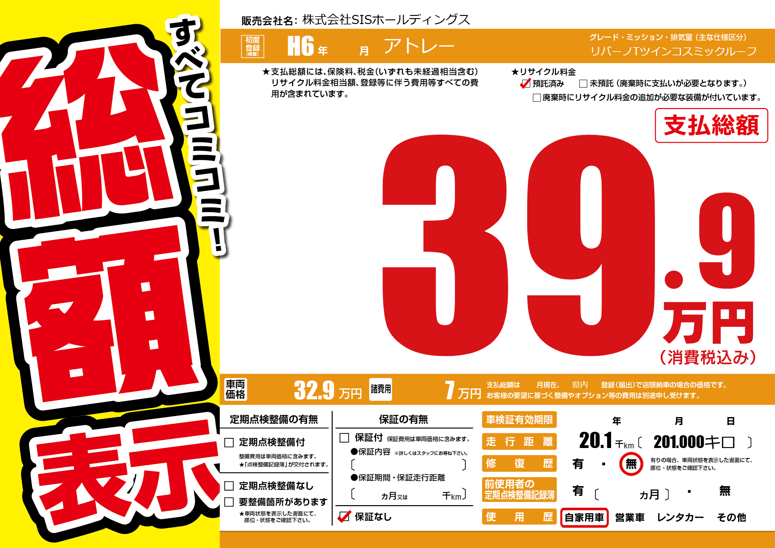 あり | リサイクル預託金相当額 | ( 0円)が別途必要 |