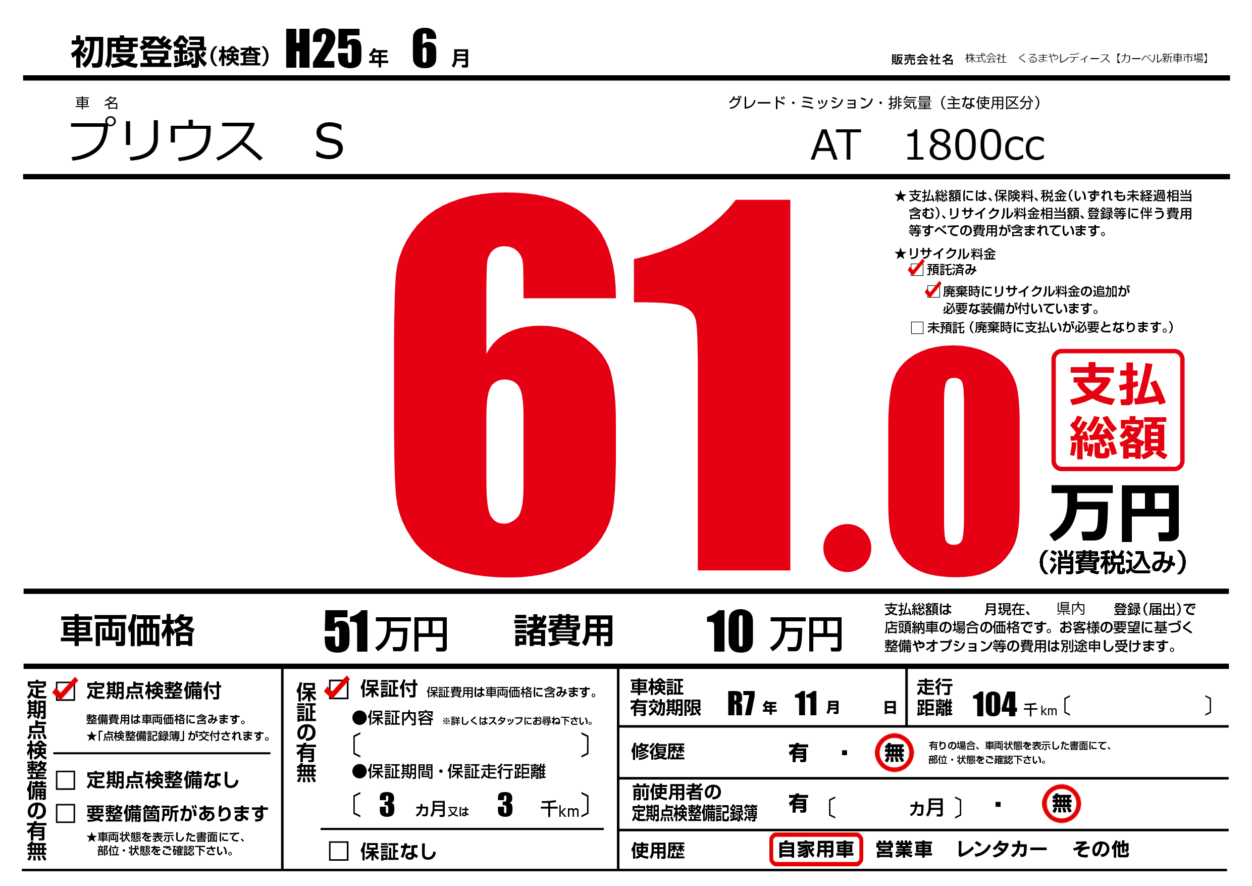 | 車名 | プリウス S | グレード ミッション 排気量 |