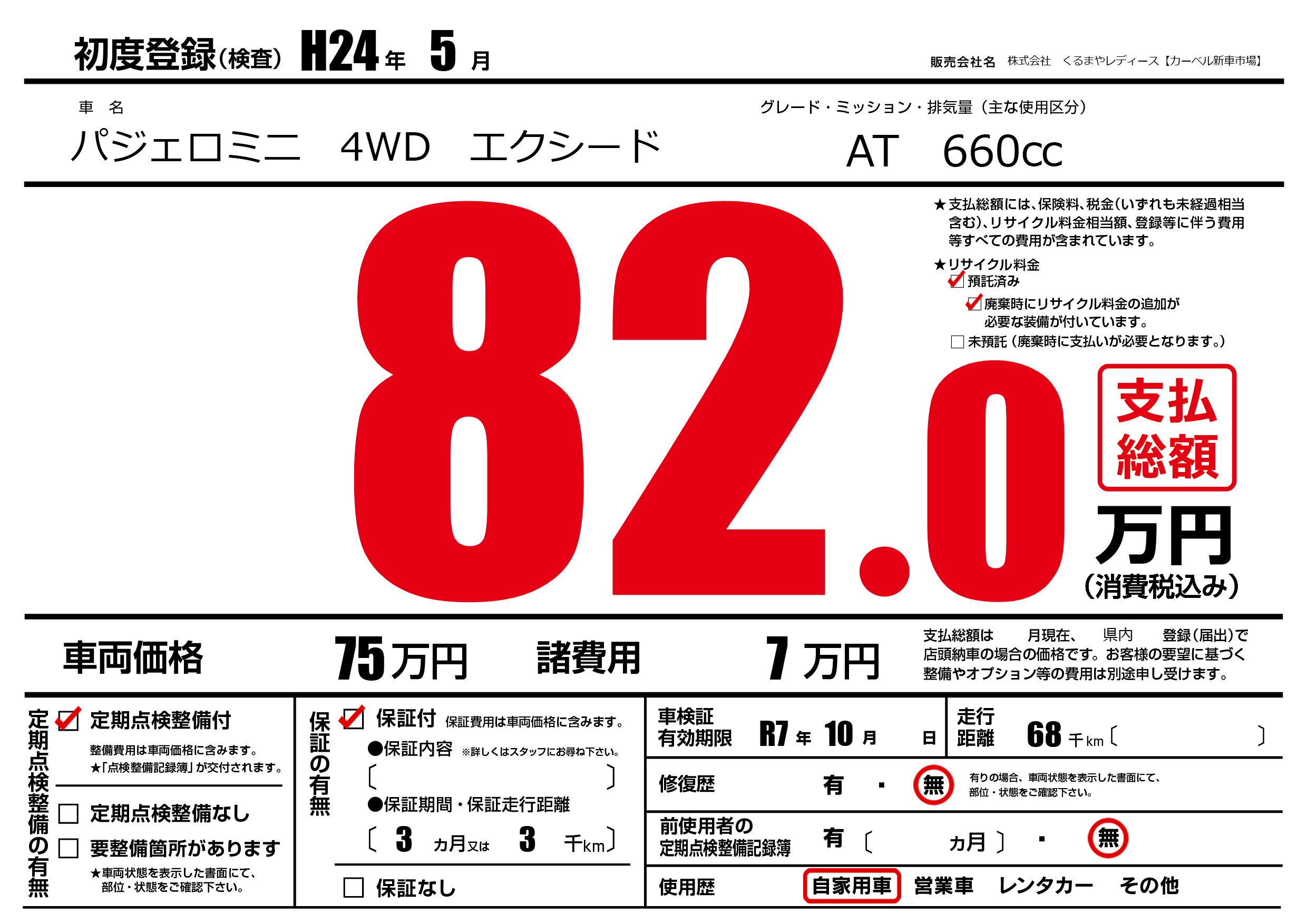 | 車名 | パジェロミニ 4WD エクシード | グレード ミッション 排気量 |