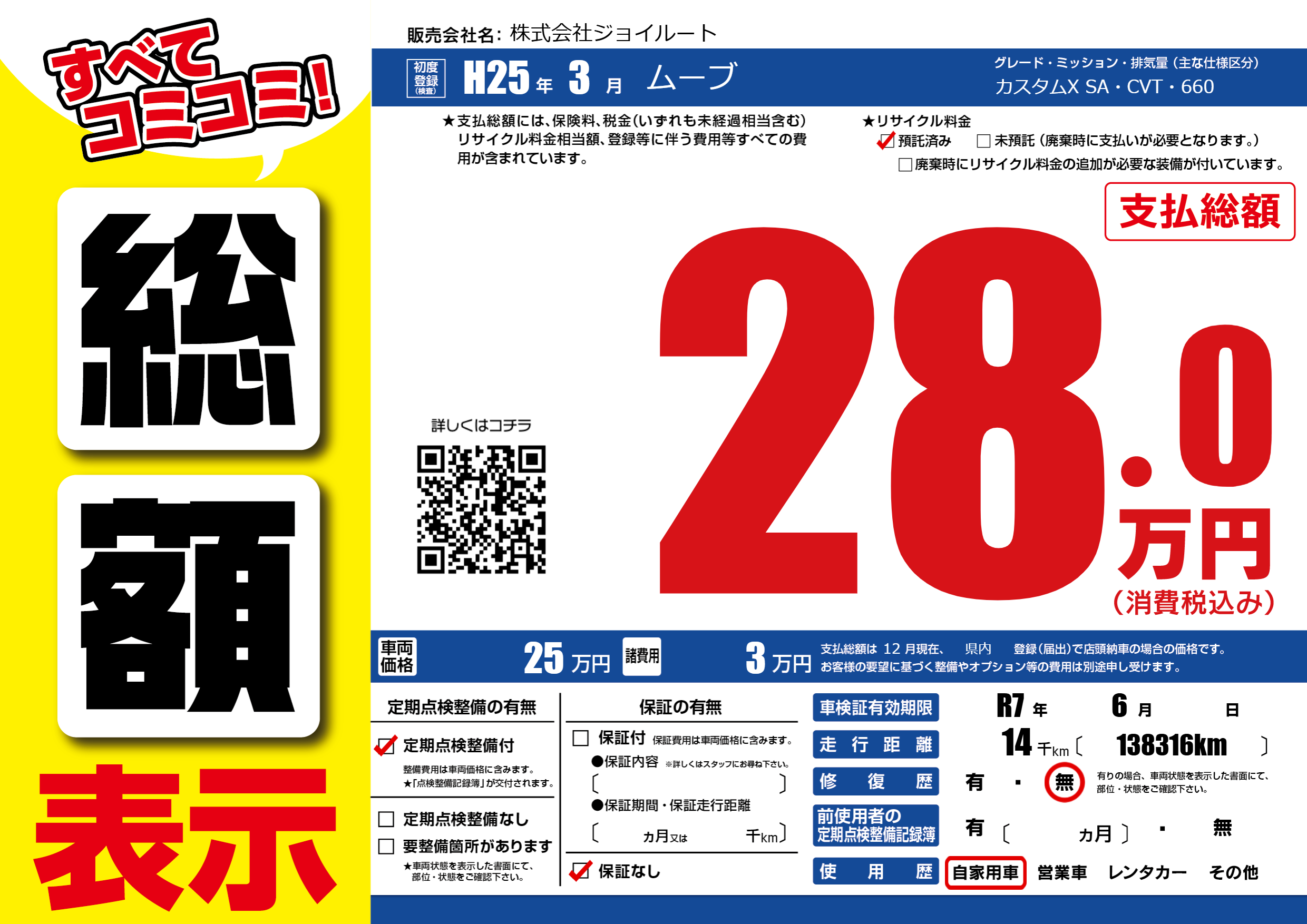| 走行キロ | 1.4万km | 初年度登録 | H25年3月 |