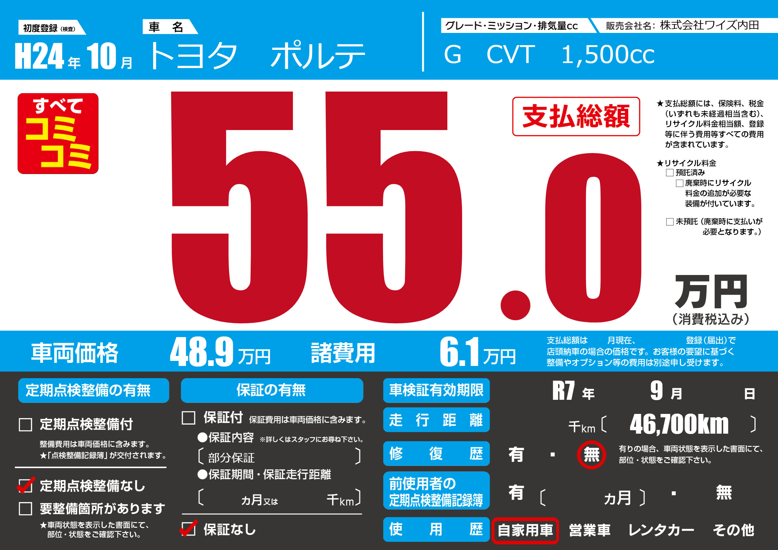 | 車名 | トヨタ ポルテ | グレード ミッション 排気量 |
