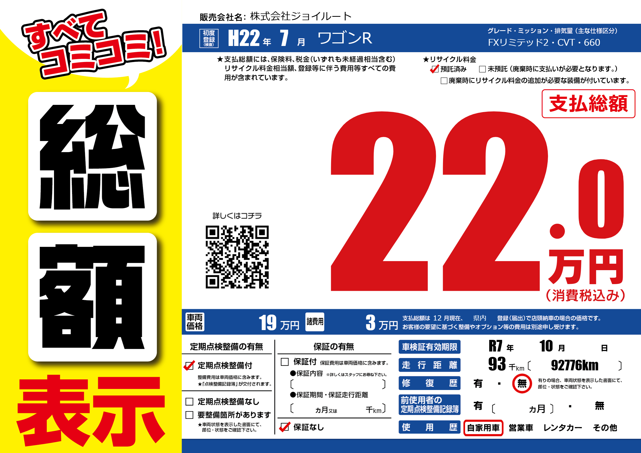 | 車検制限 | R7年 10月 - 日 | ||