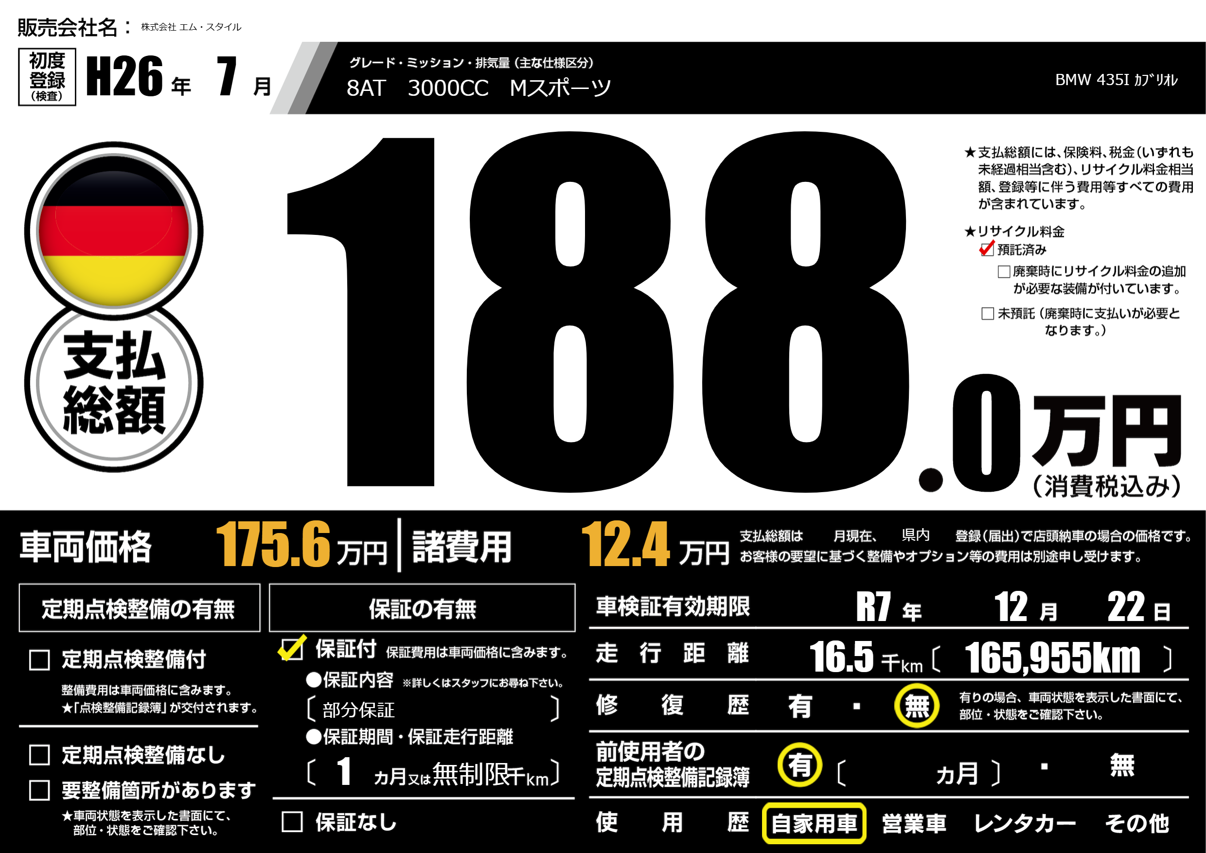 | 車名 | BMW 435I カブリオレ | グレード ミッション 排気量 |