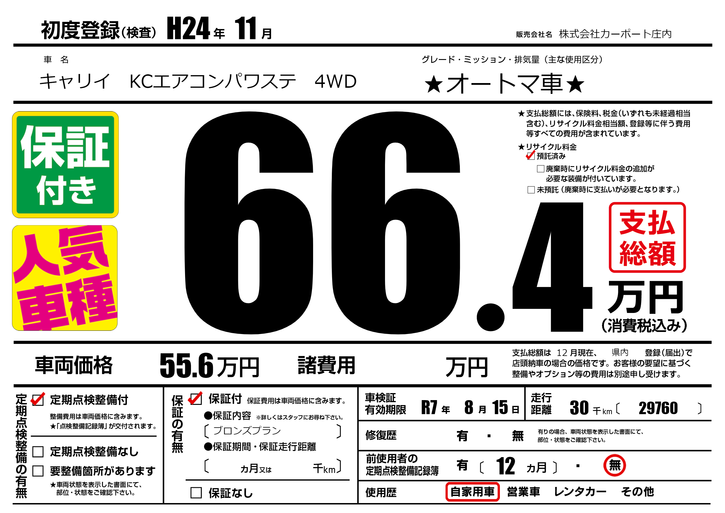 | 走行キロ | 3万km | 初年度登録 | H24年11月 |