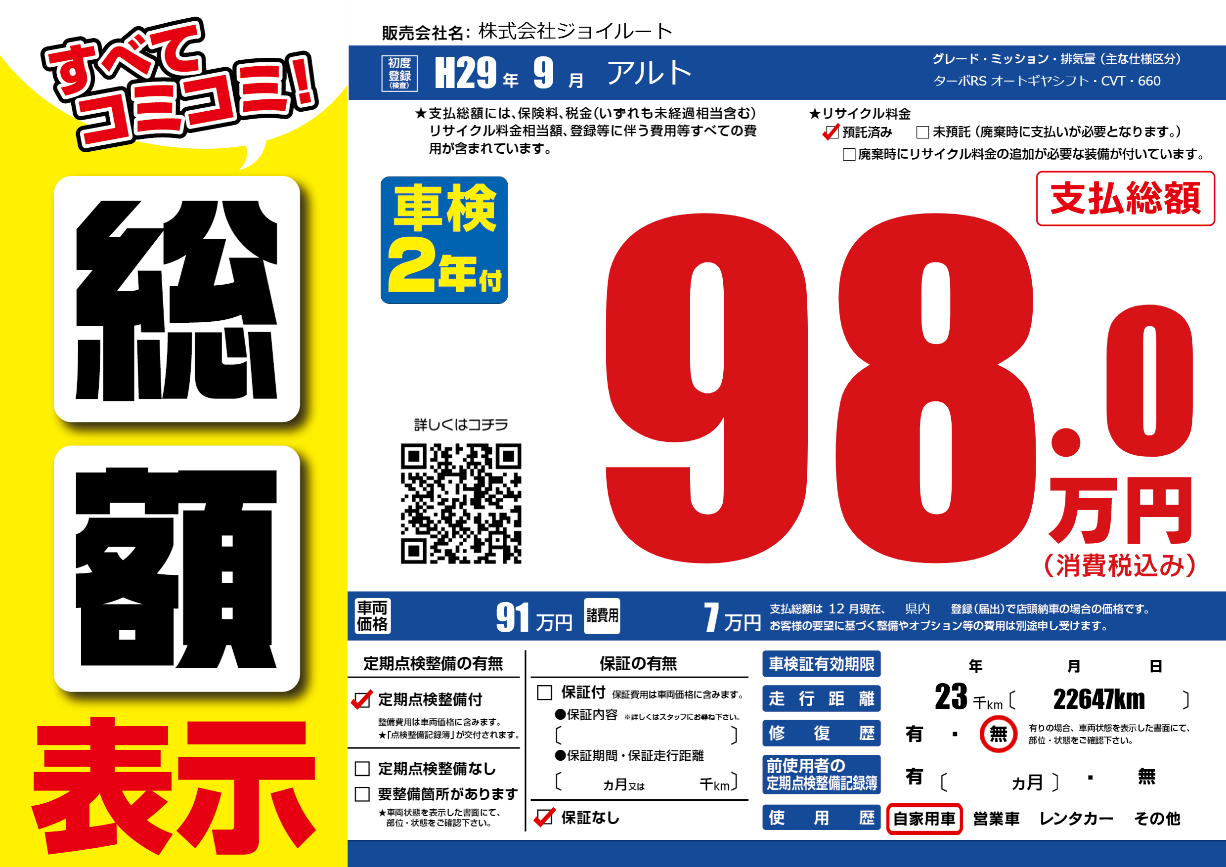 | 走行キロ | 2.3万km | 初年度登録 | H29年9月 |
