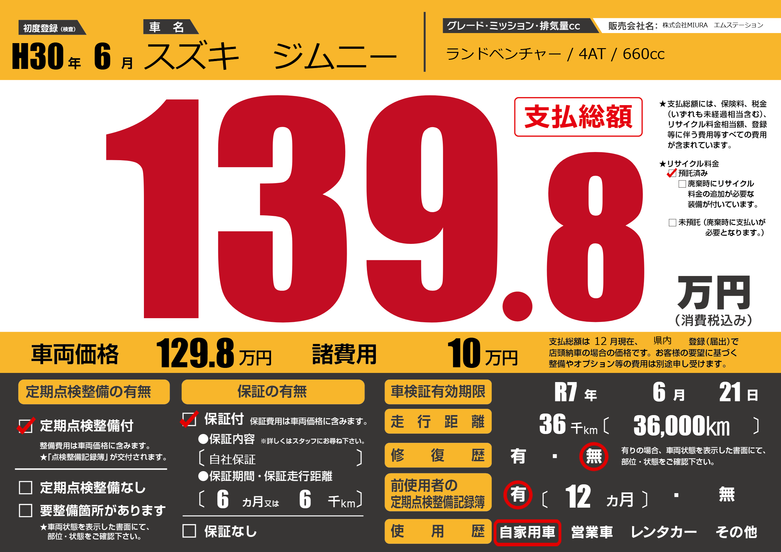 | 走行キロ | 3.6万km | 初年度登録 | H30年6月 |