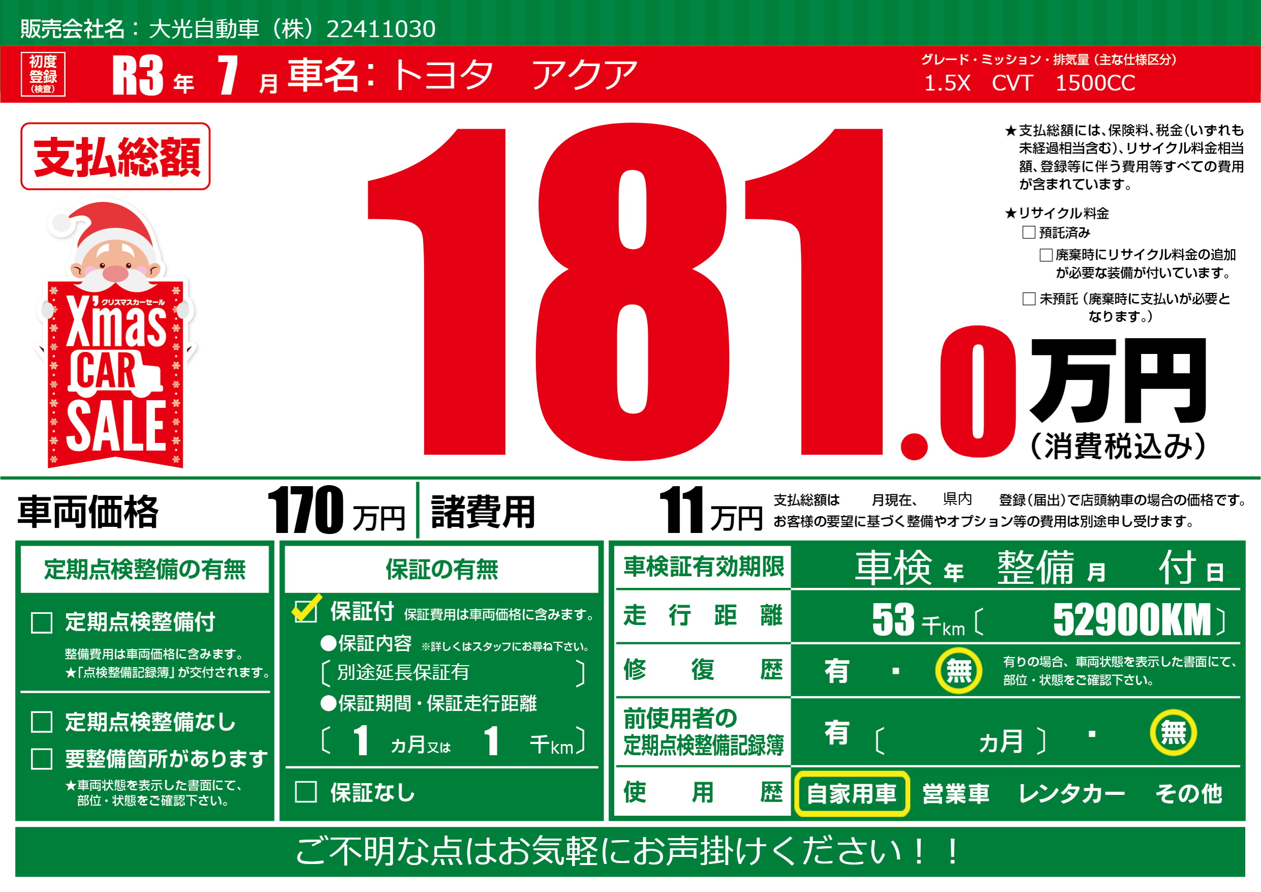 保証なし 保証内容(別途延長保証有) 1ヶ月または(1)千kmまで |