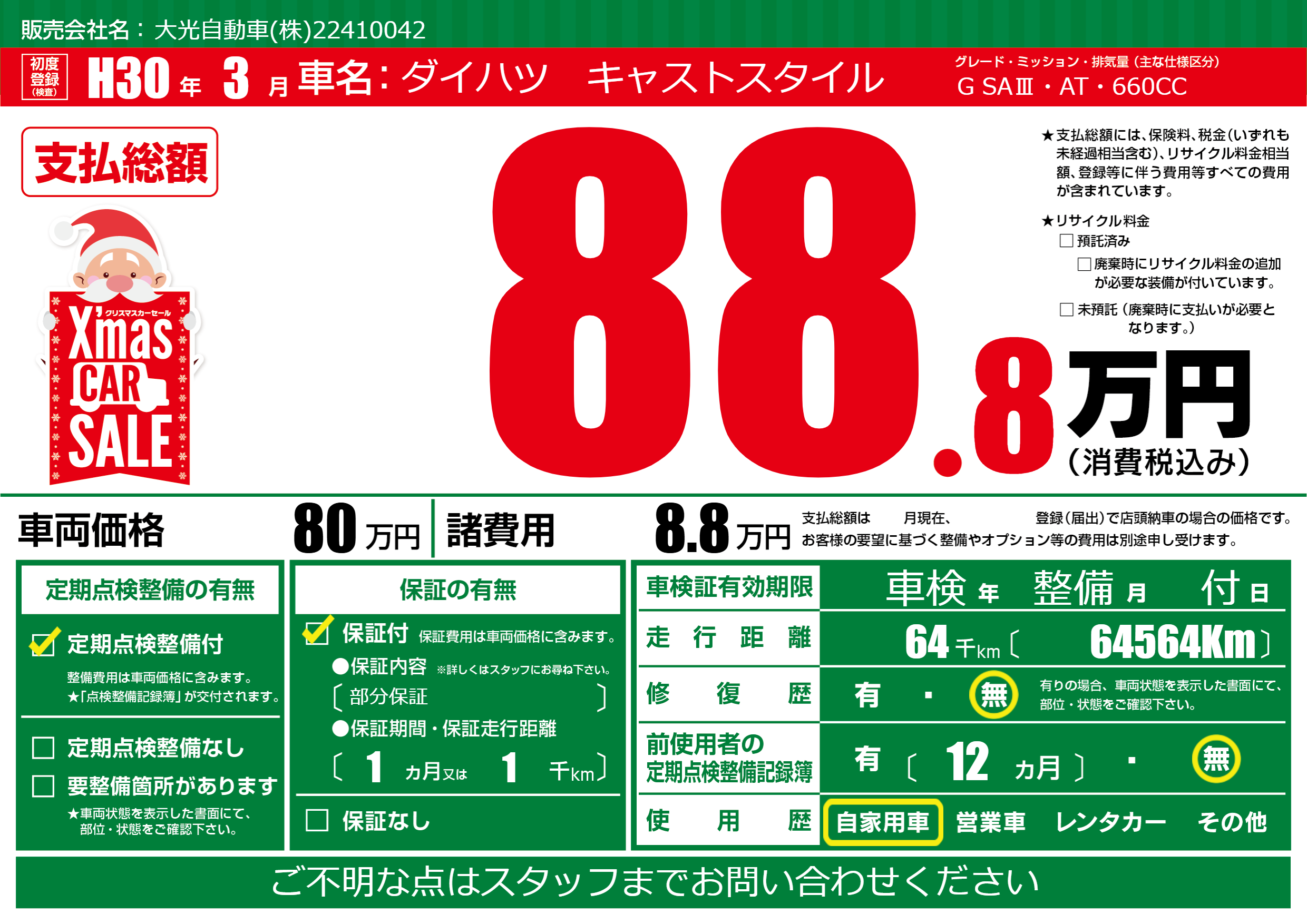 | 車名 | ダイハツ キャストスタイル | グレード ミッション 排気量 |