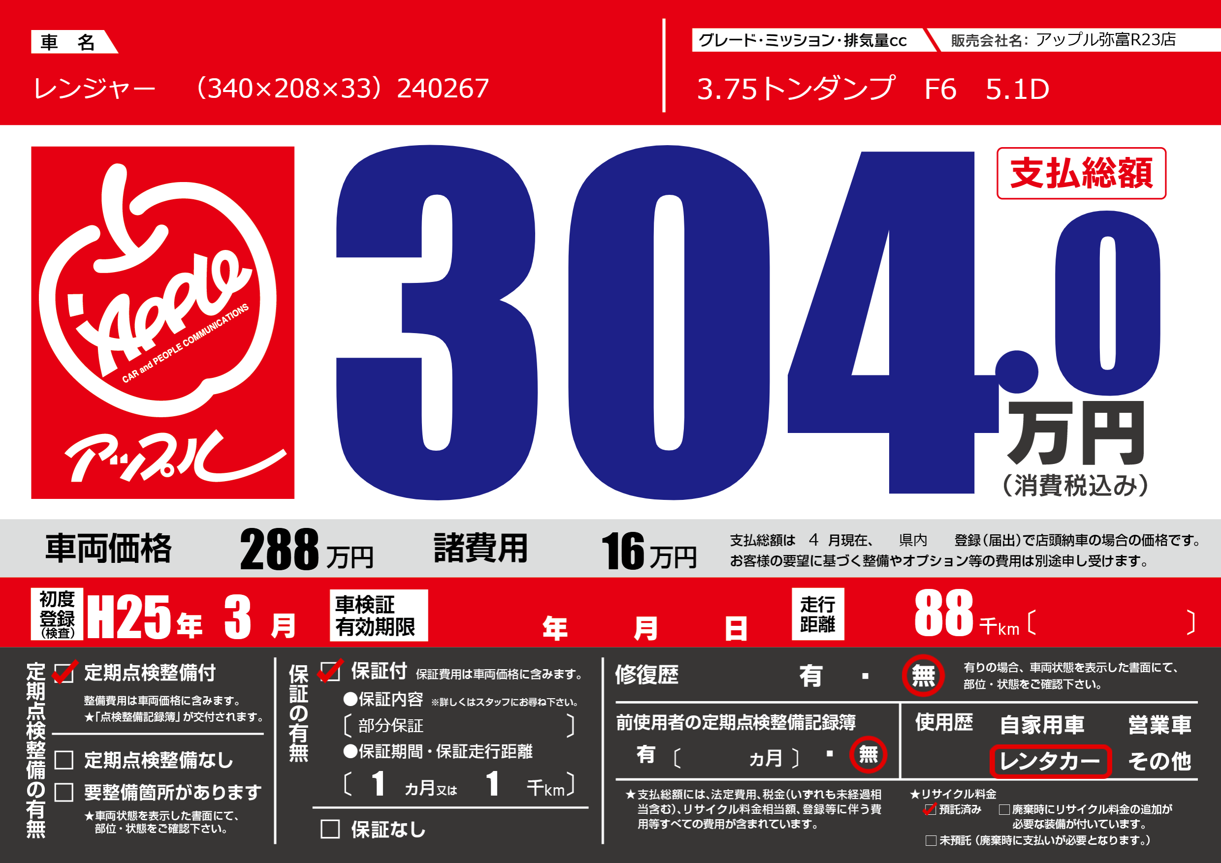 | 車名 | レンジャー (340×208×33)240267 | グレード ミッション 排気量 |