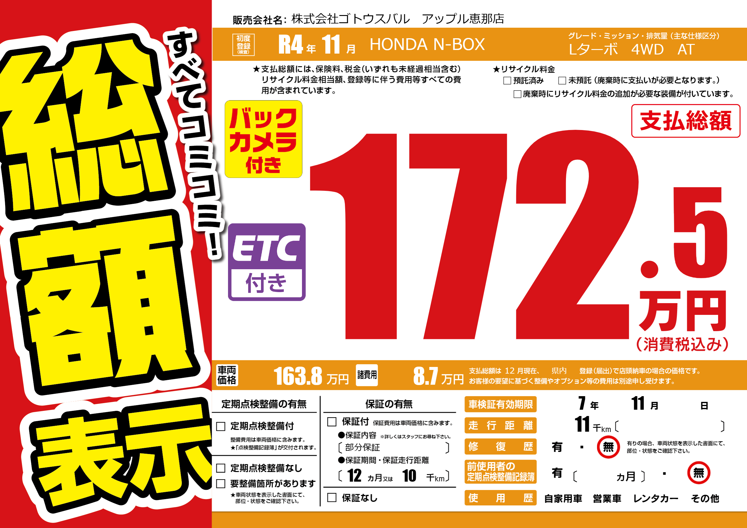 | 走行キロ | 1.1万km | 初年度登録 | R4年11月 |