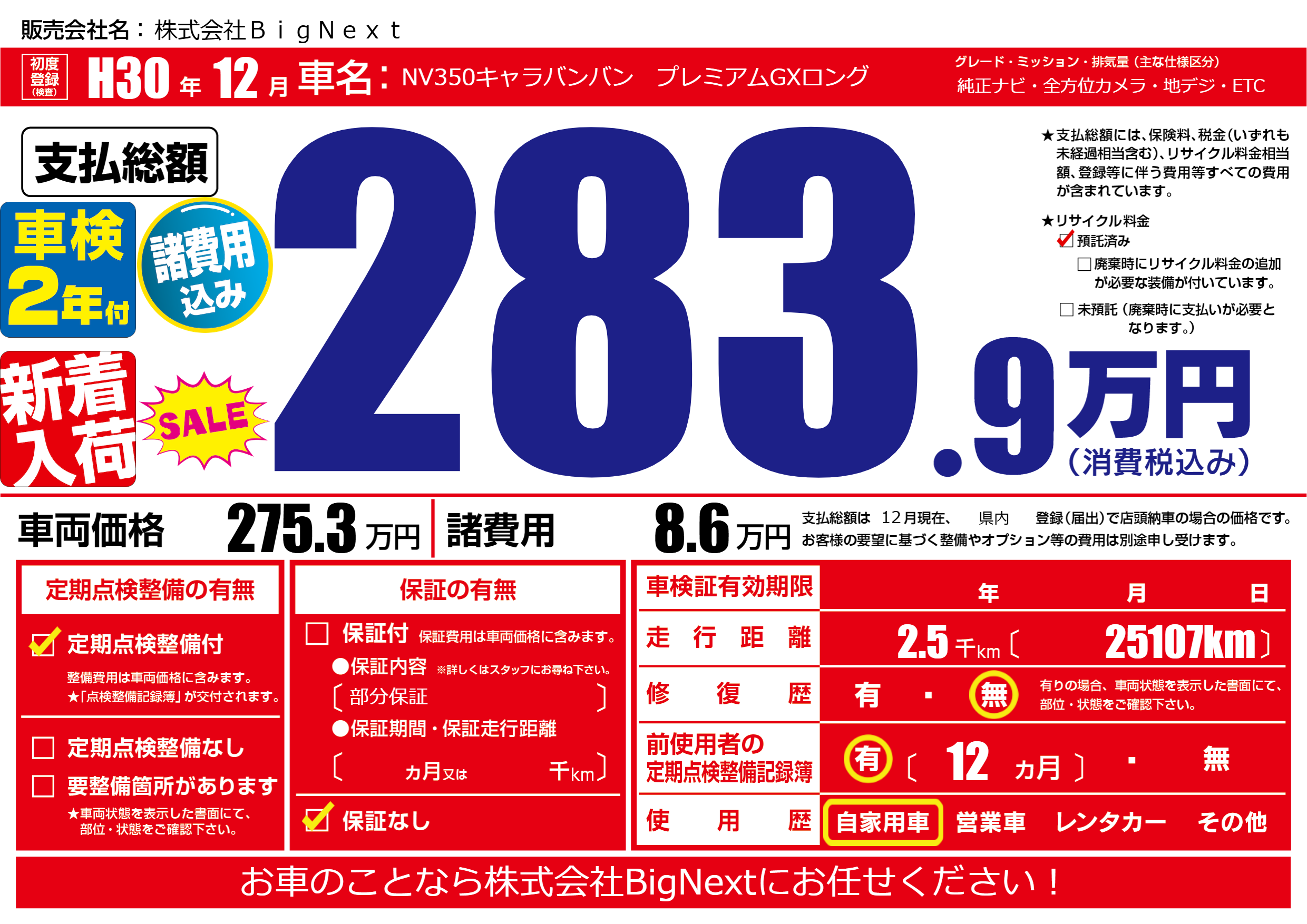| 車名 | NV350キャラバンバン プレミアムGXロング | グレード ミッション 排気量 |