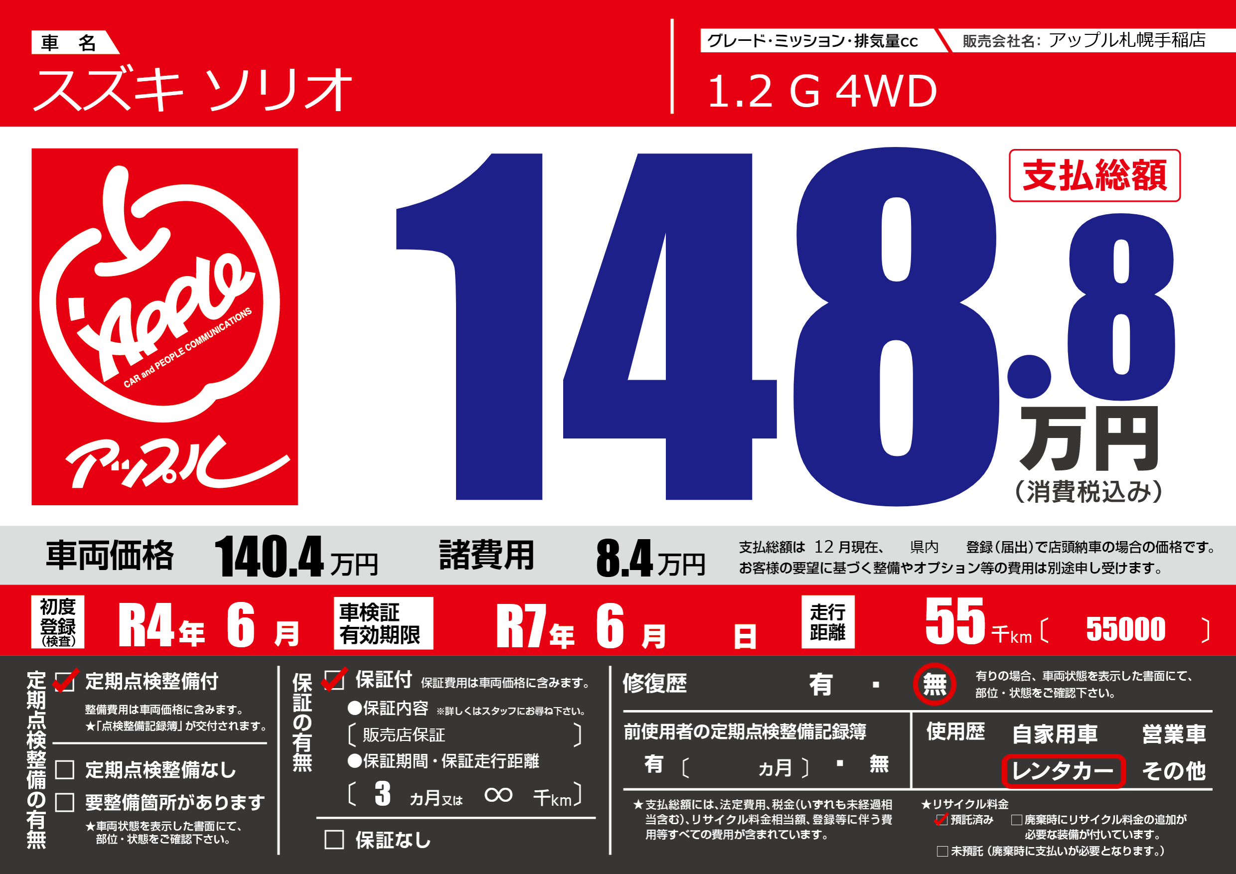 保証なし 保証内容(販売店保証) 3ヶ月または(∞)千kmまで |