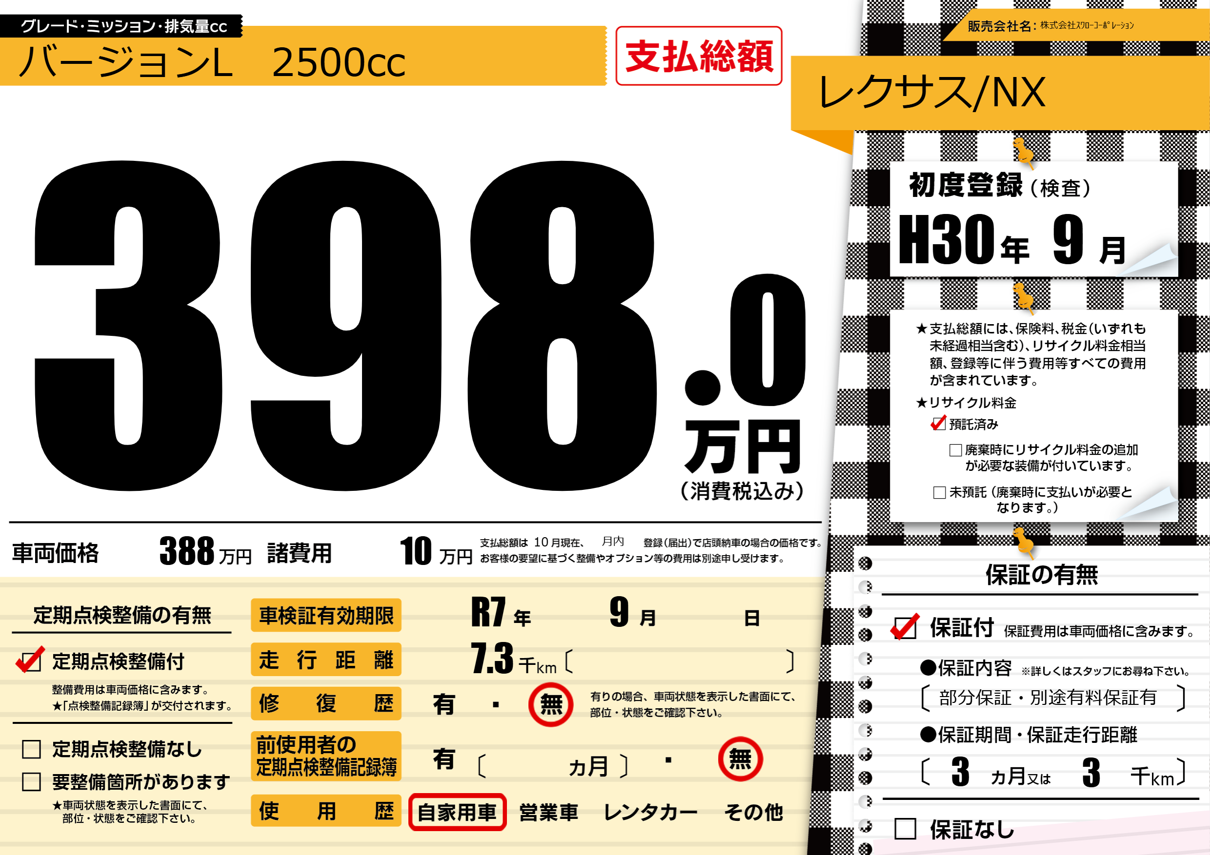 | 車名 | レクサス/NX | グレード ミッション 排気量 |