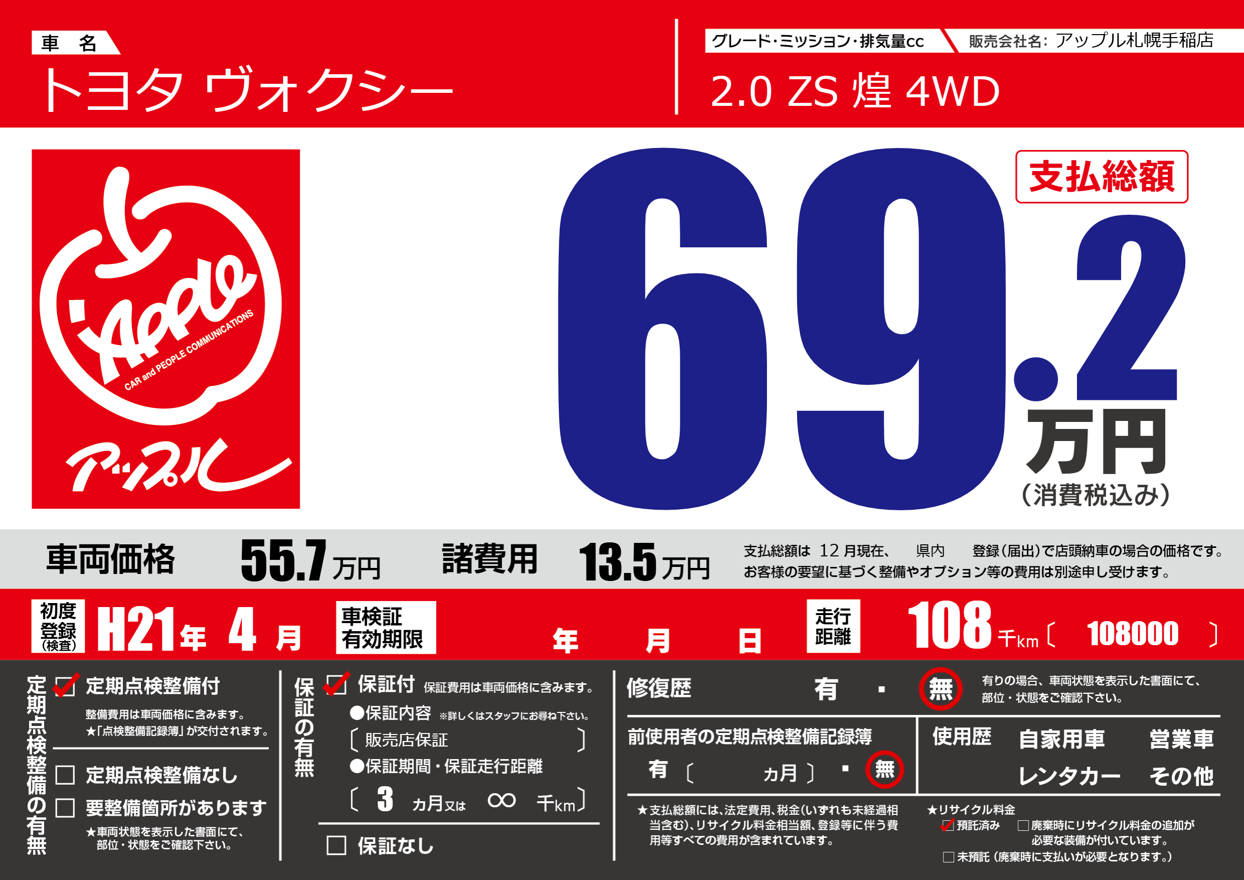 | 走行キロ | 10.8万km | 初年度登録 | H21年4月 |