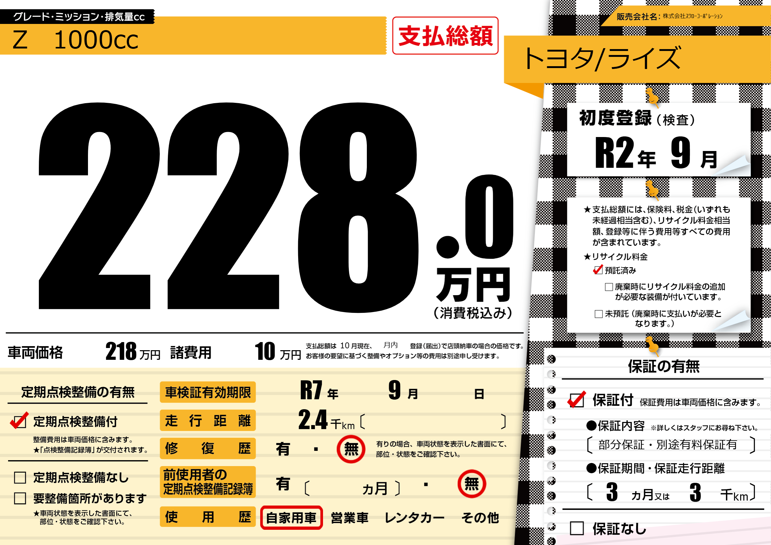 | 車名 | トヨタ/ライズ | グレード ミッション 排気量 |