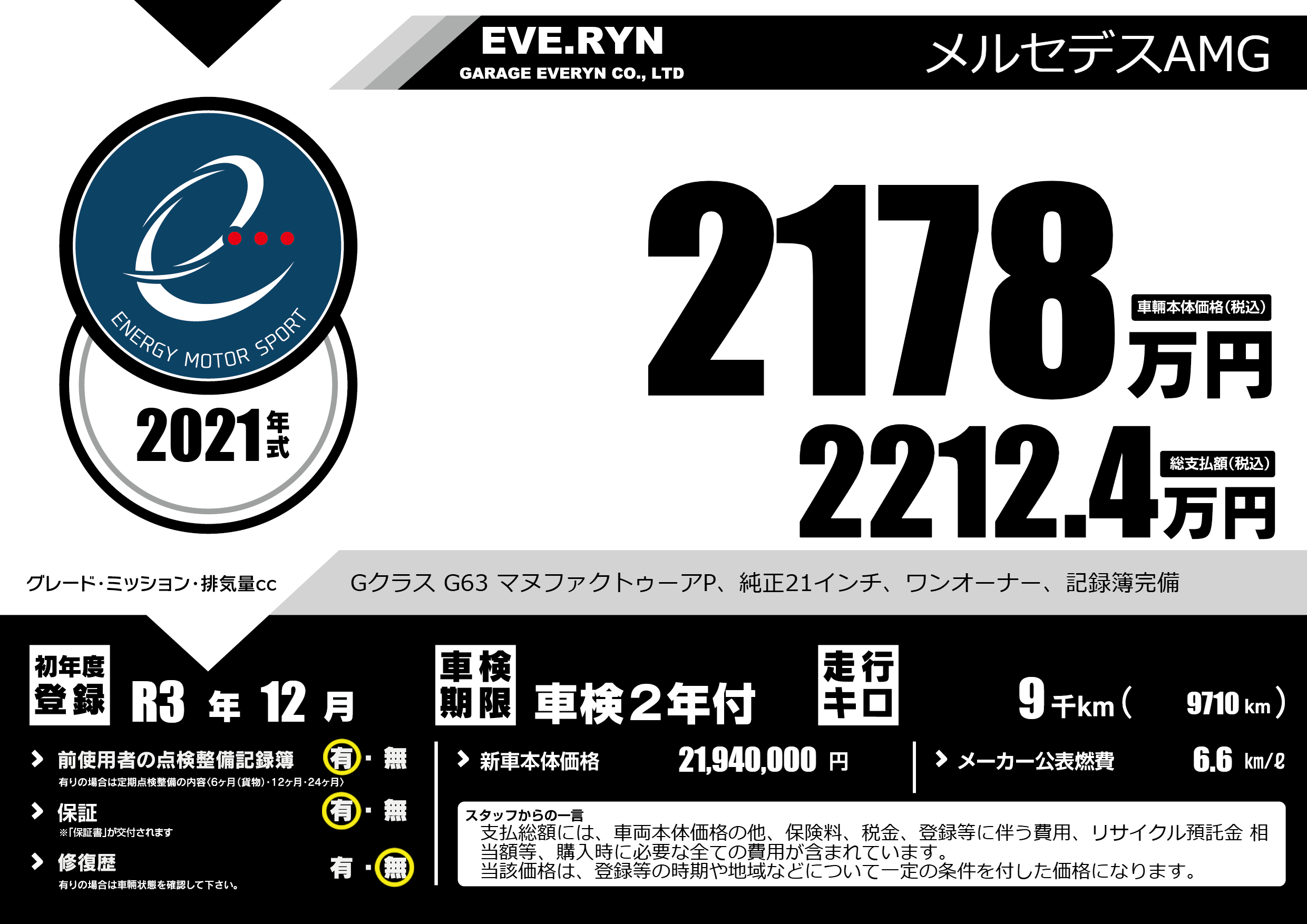 Gクラス G63 マヌファクトゥーアP、純正21インチ、ワンオーナー、記録簿完備 |
