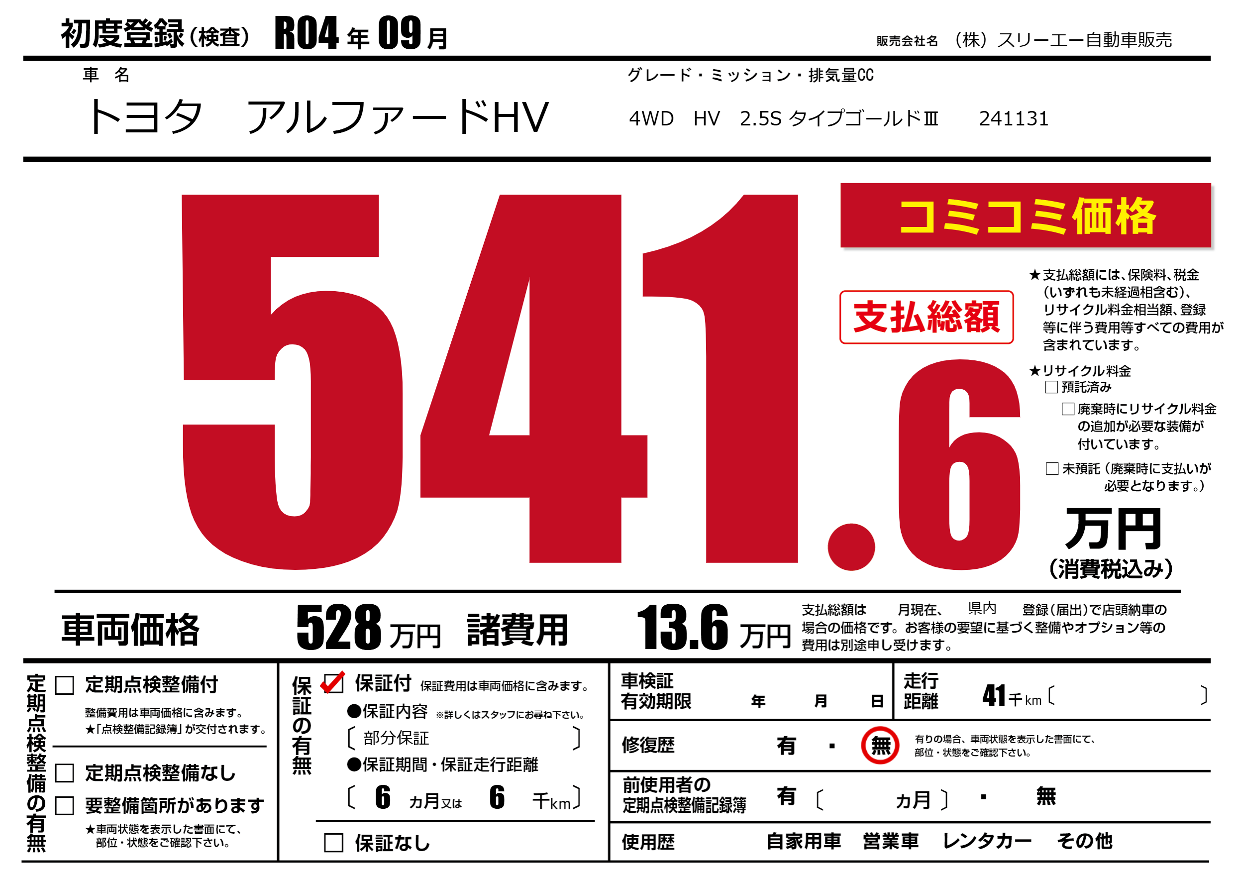 保証付き 保証内容(部分保証) 6ヶ月または(6)千kmまで |