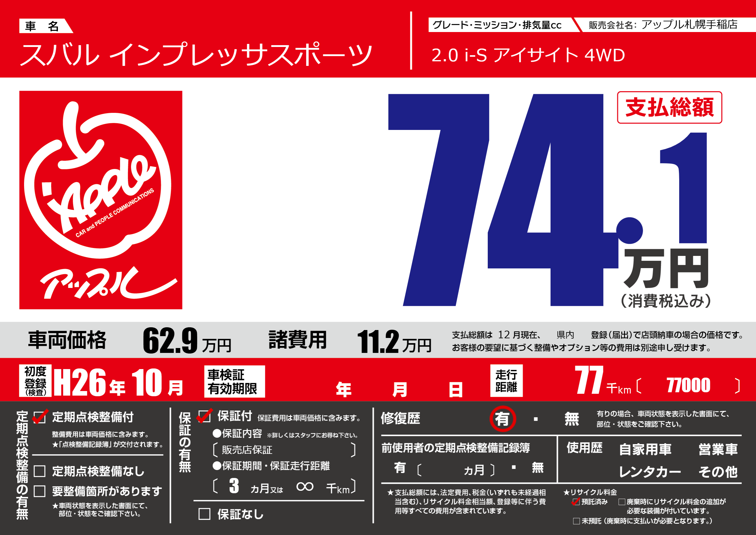 | 車名 | スバル インプレッサスポーツ | グレード ミッション 排気量 |