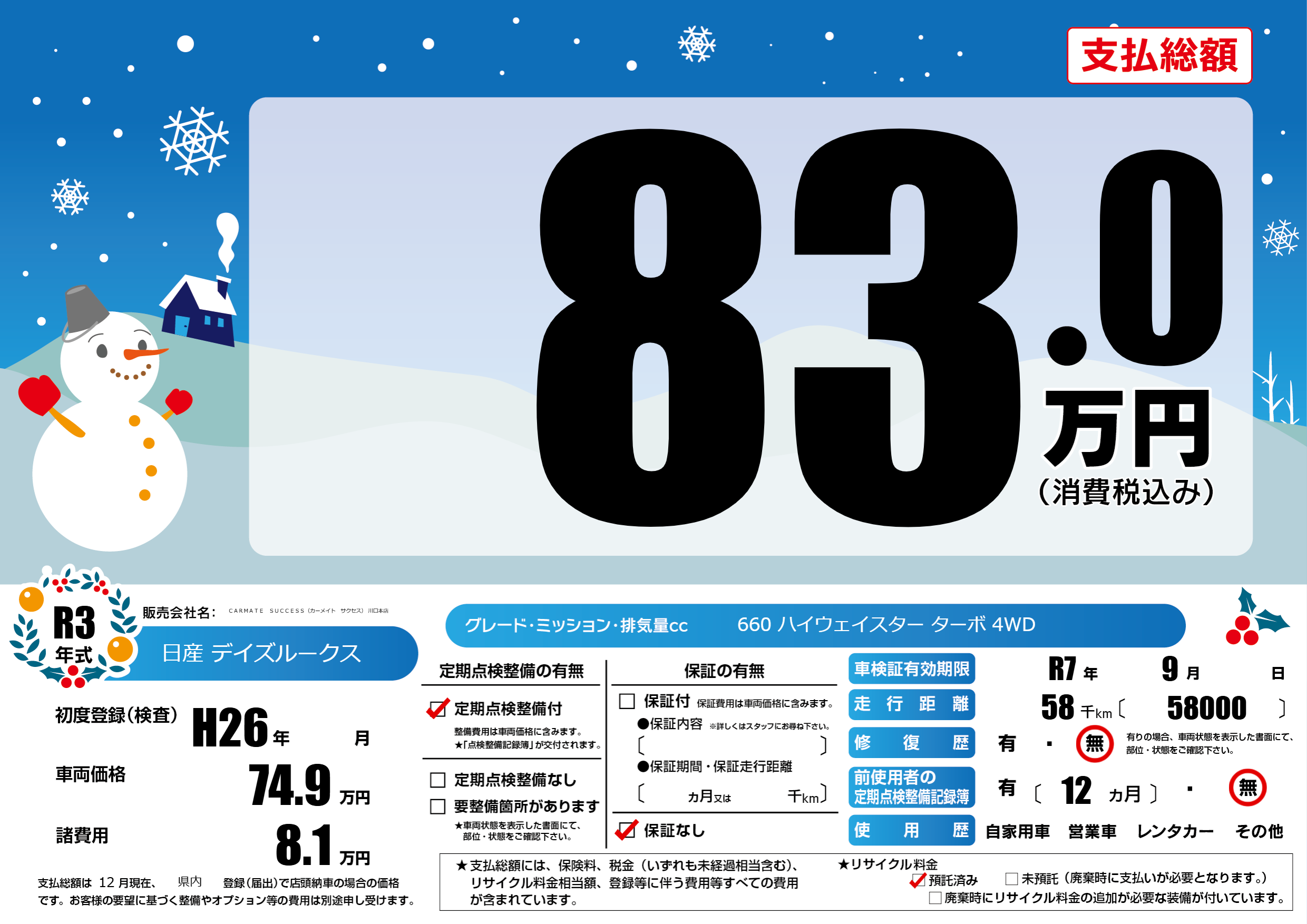 | 車名 | 日産 デイズルークス | グレード ミッション 排気量 |