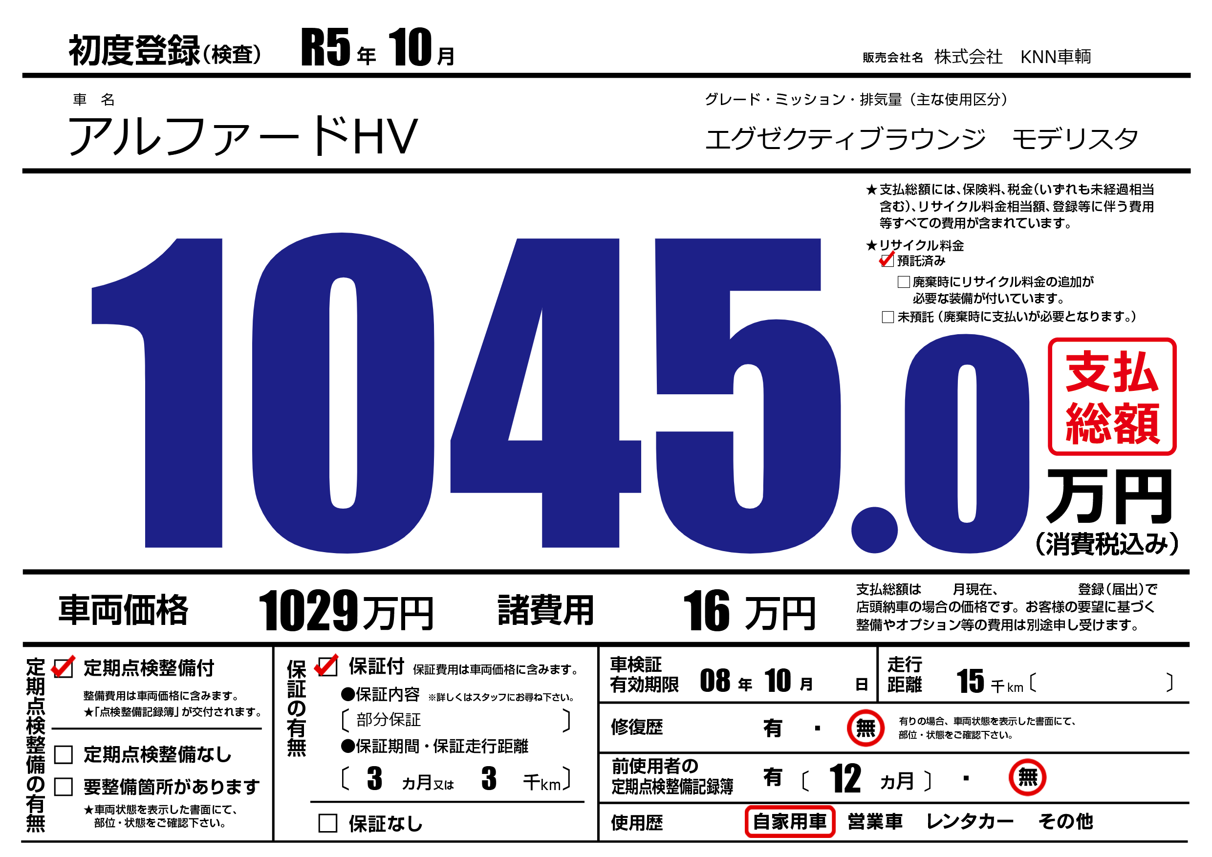 | 走行キロ | 1.5万km | 初年度登録 | R5年10月 |