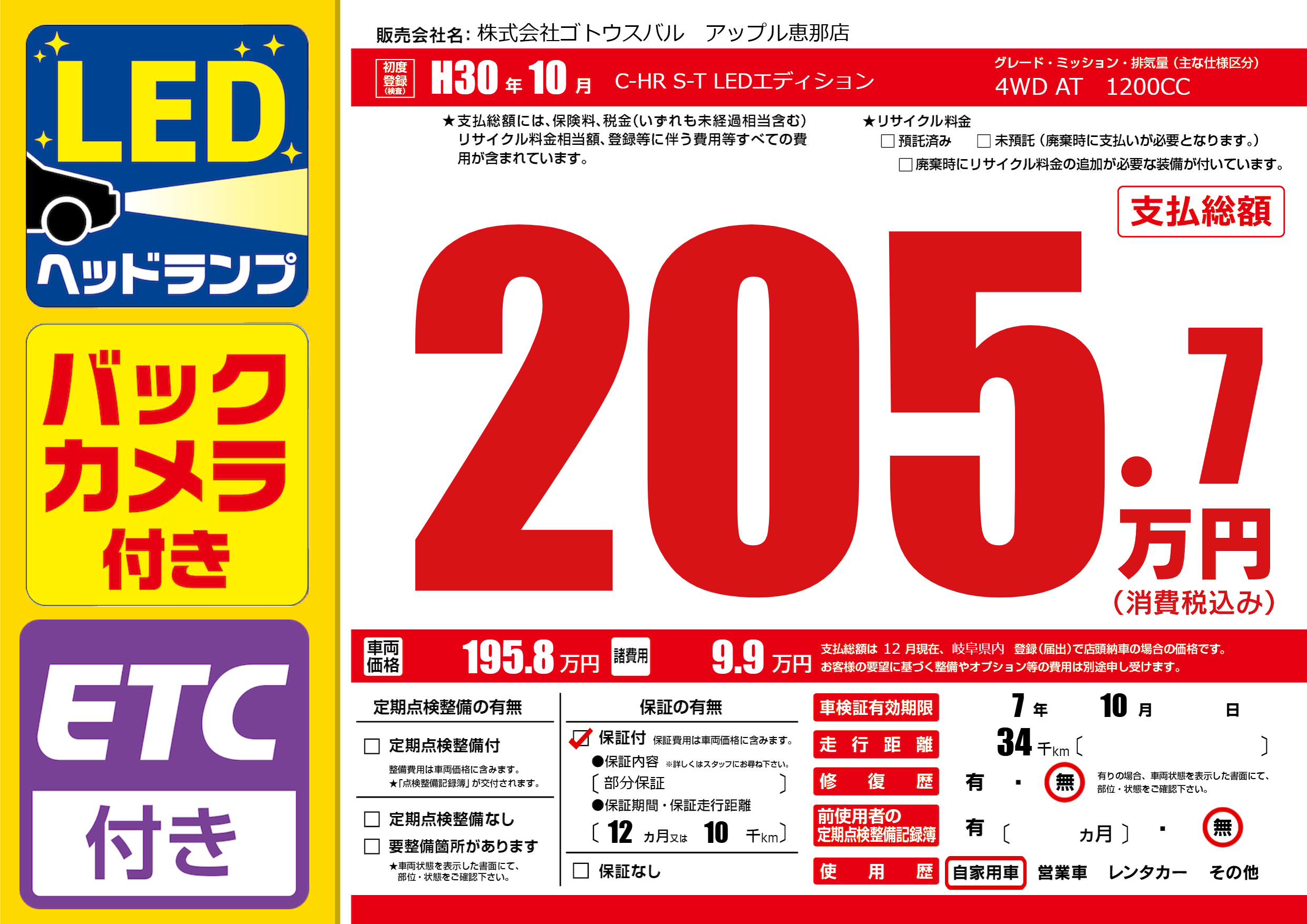 保証付き 保証内容(部分保証) 12ヶ月または(10)千kmまで |