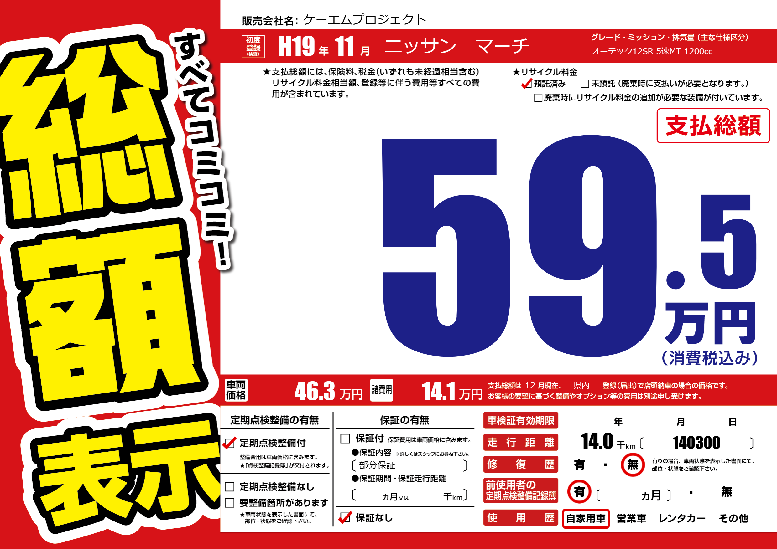 | 車名 | ニッサン マーチ | グレード ミッション 排気量 |