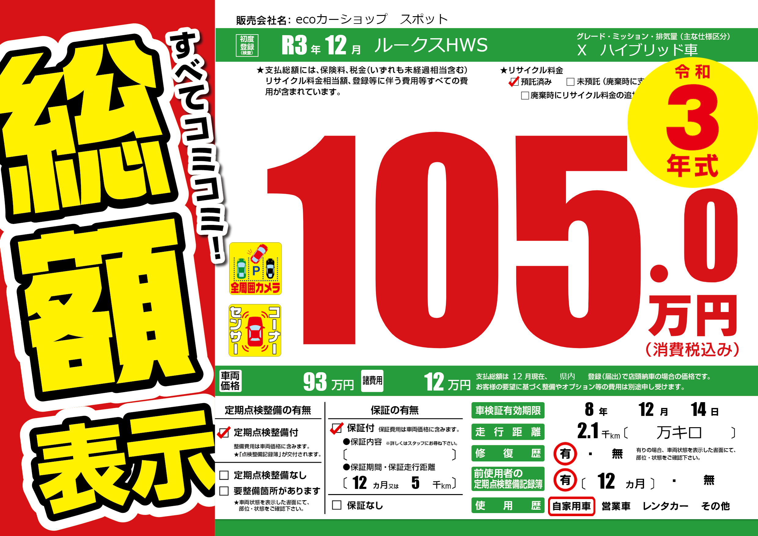 | 走行キロ | 0.2万km | 初年度登録 | R3年12月 |
