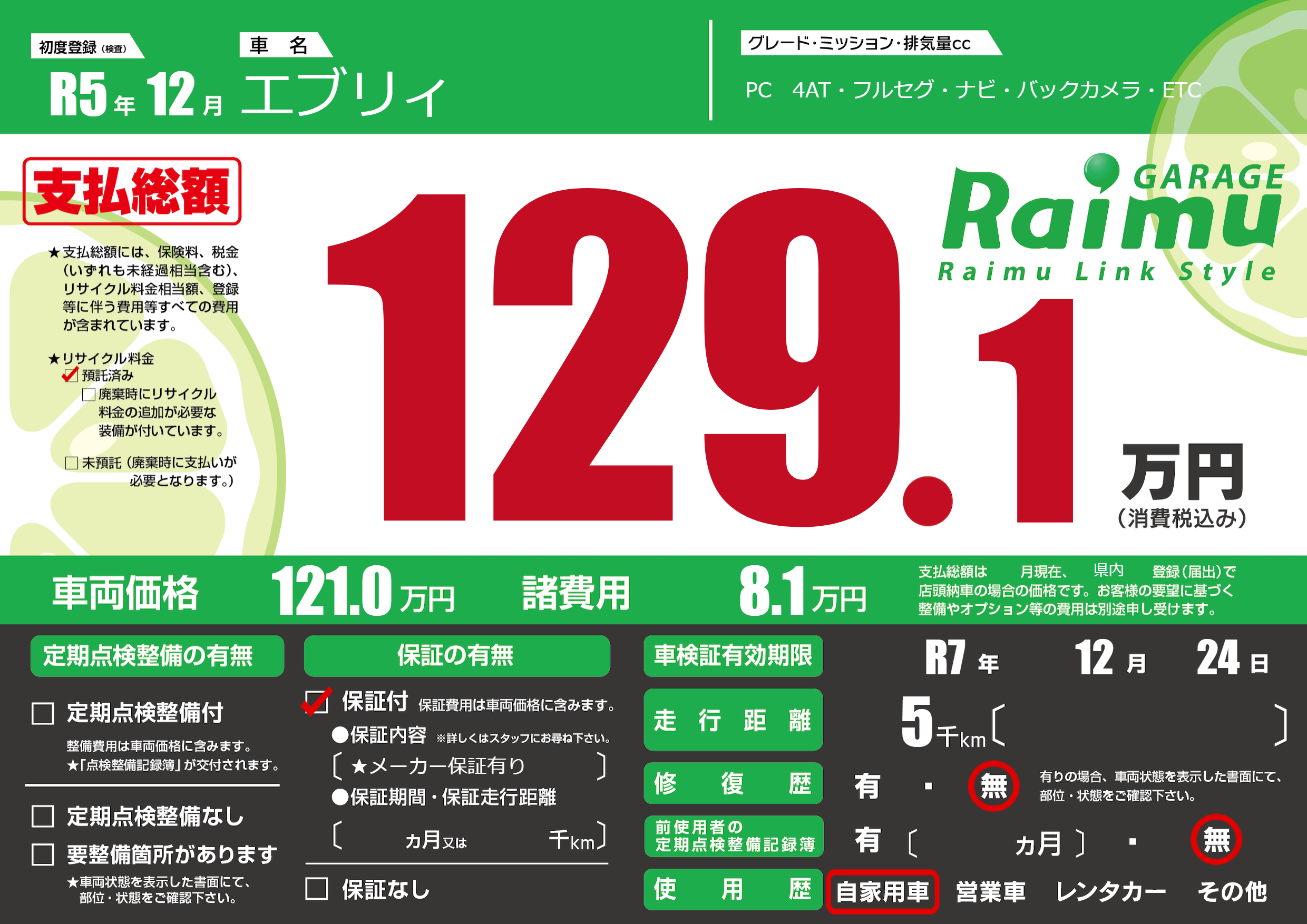 | 走行キロ | 0.5万km | 初年度登録 | R5年12月 |