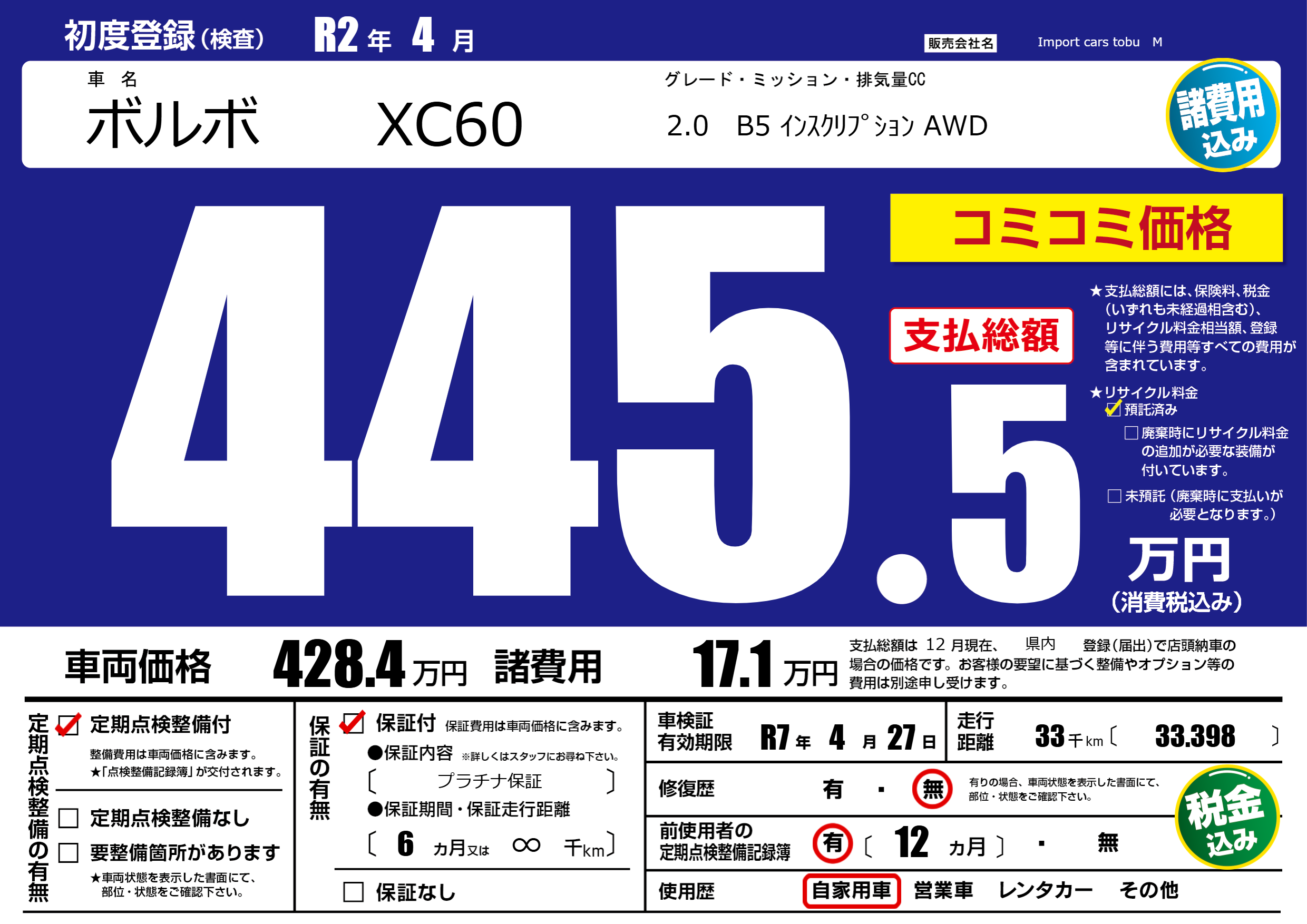 | 車検制限 | R7年 4月 27日 | ||