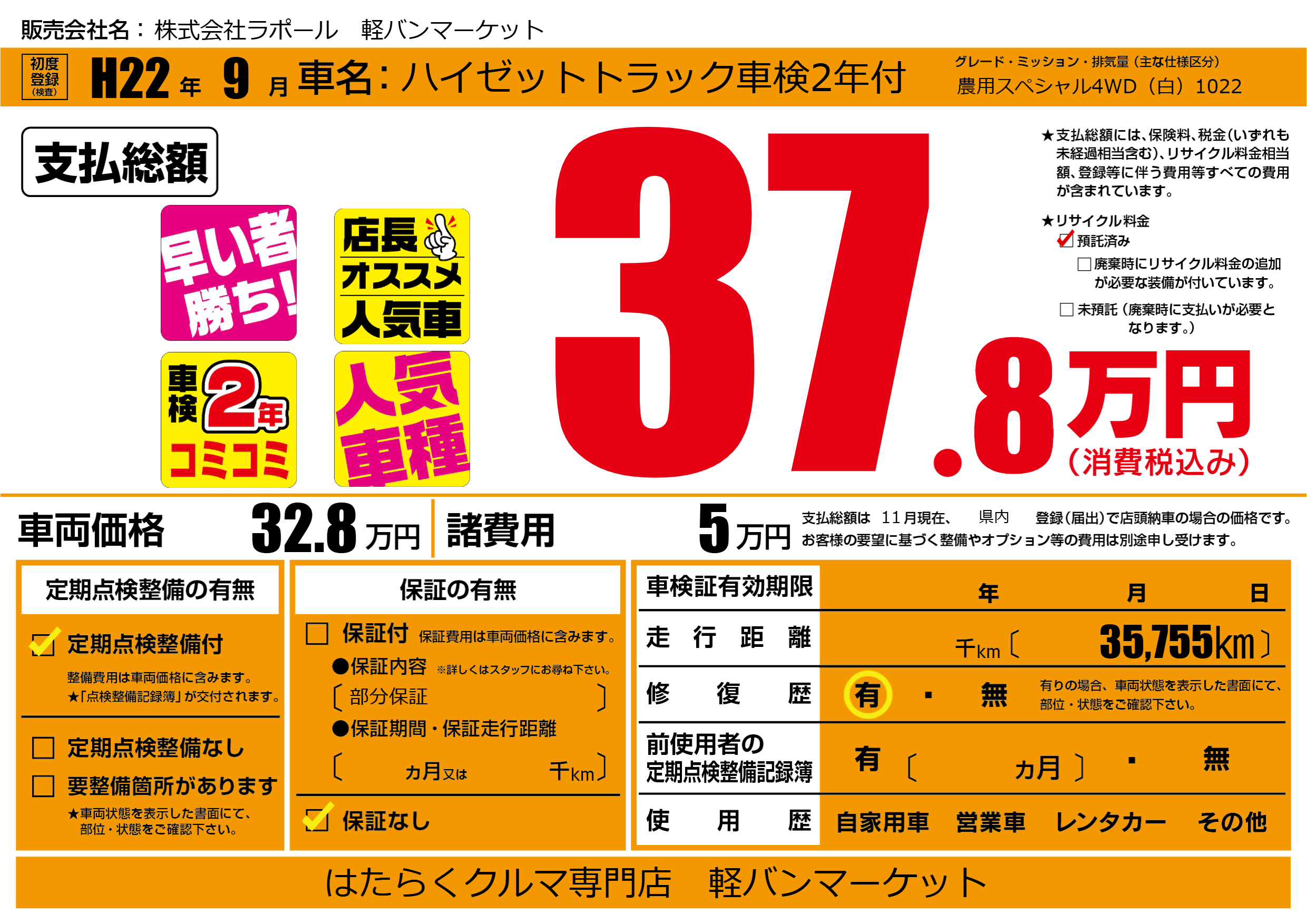 | 車名 | ハイゼットトラック車検2年付 | グレード ミッション 排気量 |