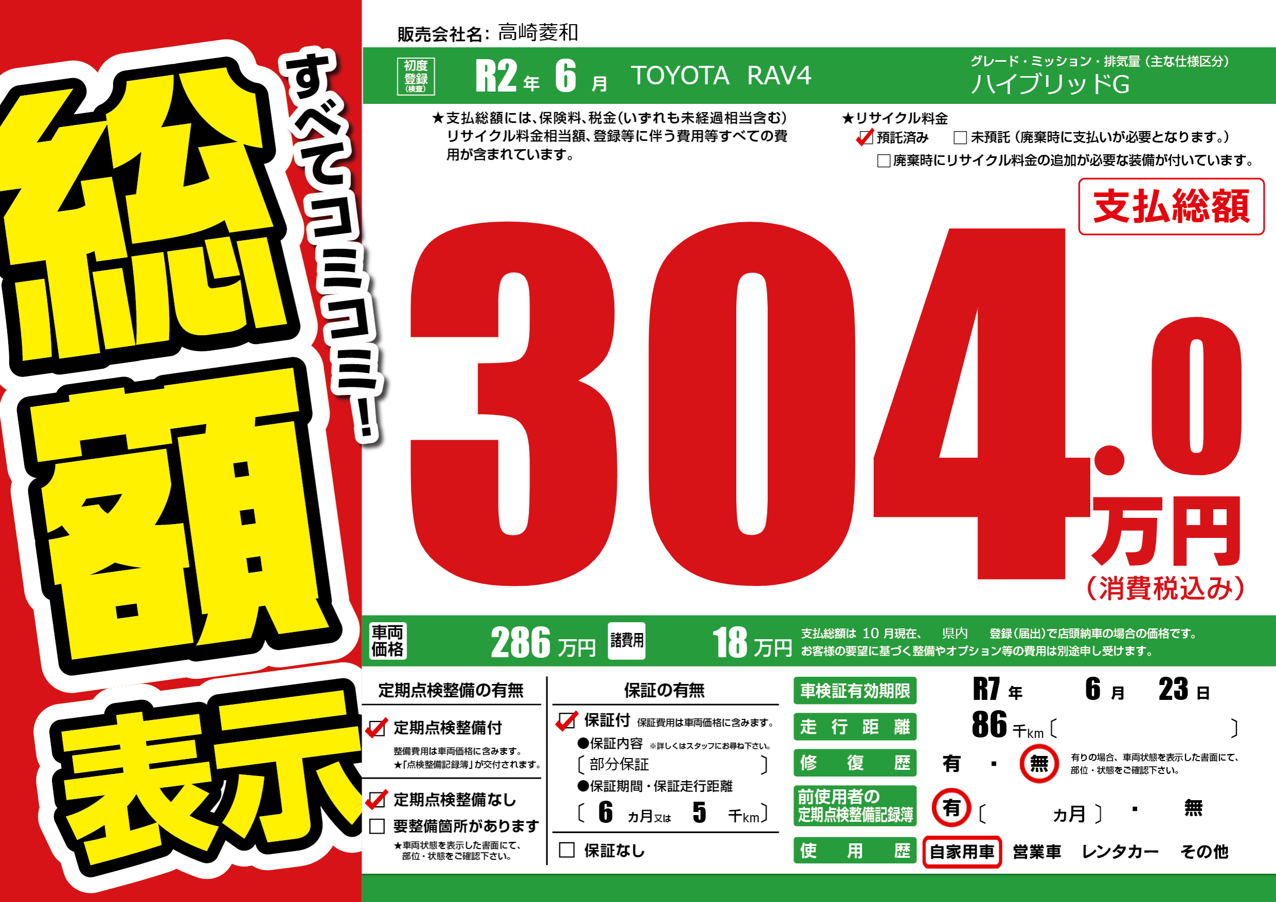 | 車名 | TOYOTA RAV4 | グレード ミッション 排気量 |