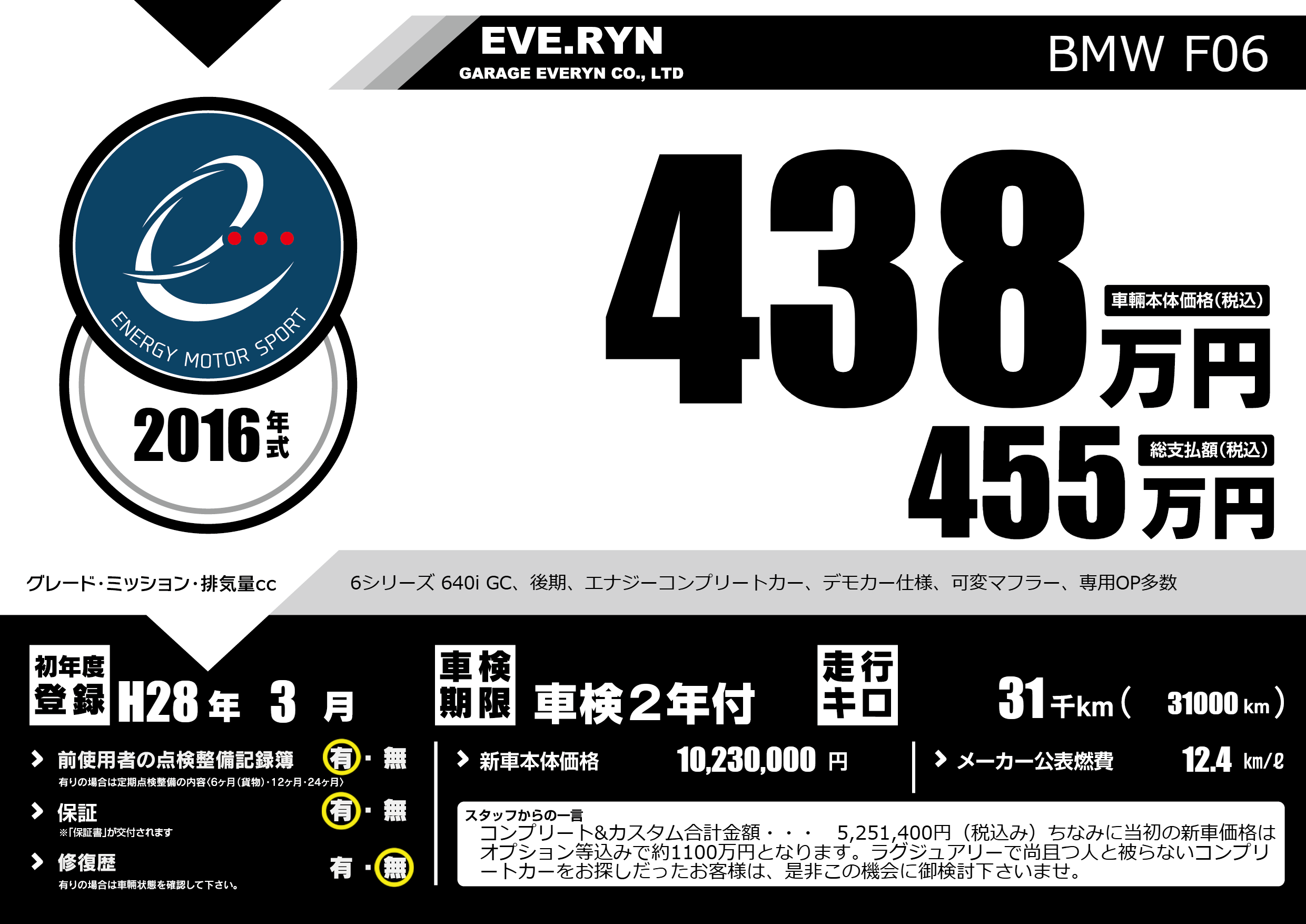 | 車名 | BMW F06 | グレード ミッション 排気量 |