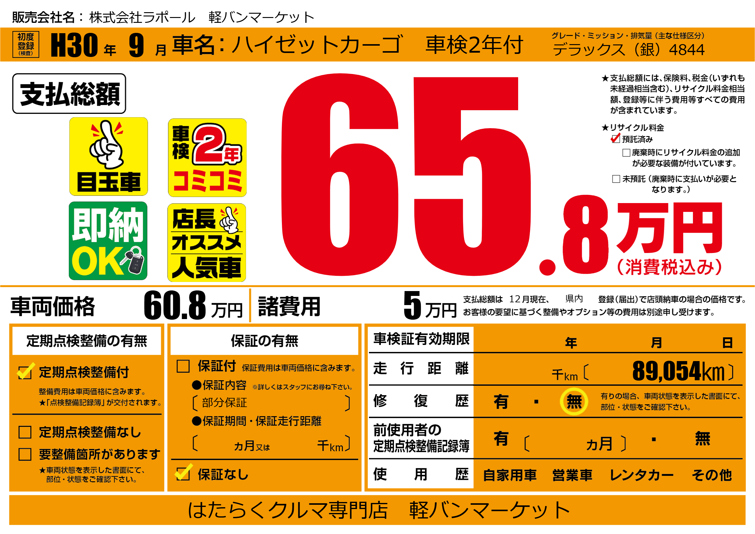 | 車名 | ハイゼットカーゴ 車検2年付 | グレード ミッション 排気量 |