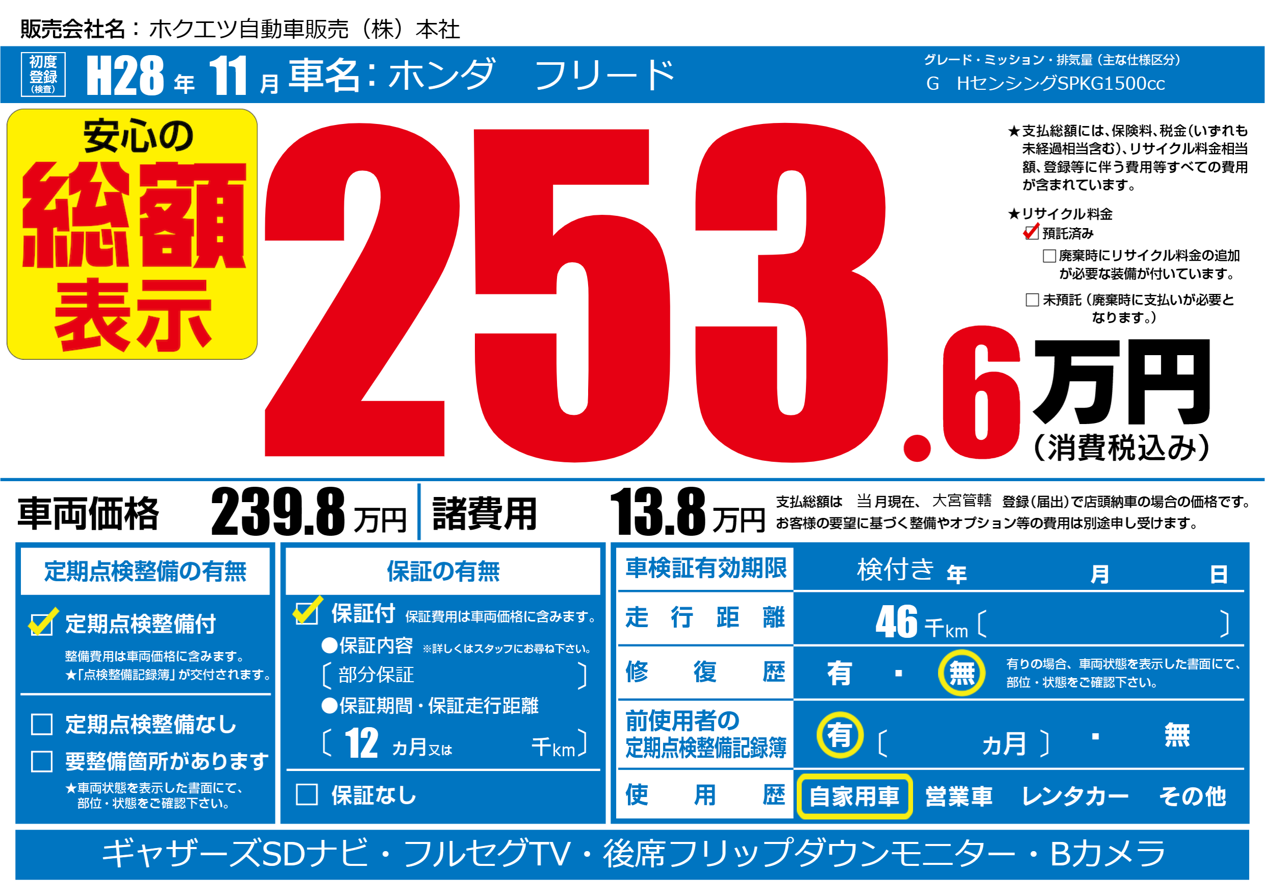 | 車名 | ホンダ フリード | グレード ミッション 排気量 |