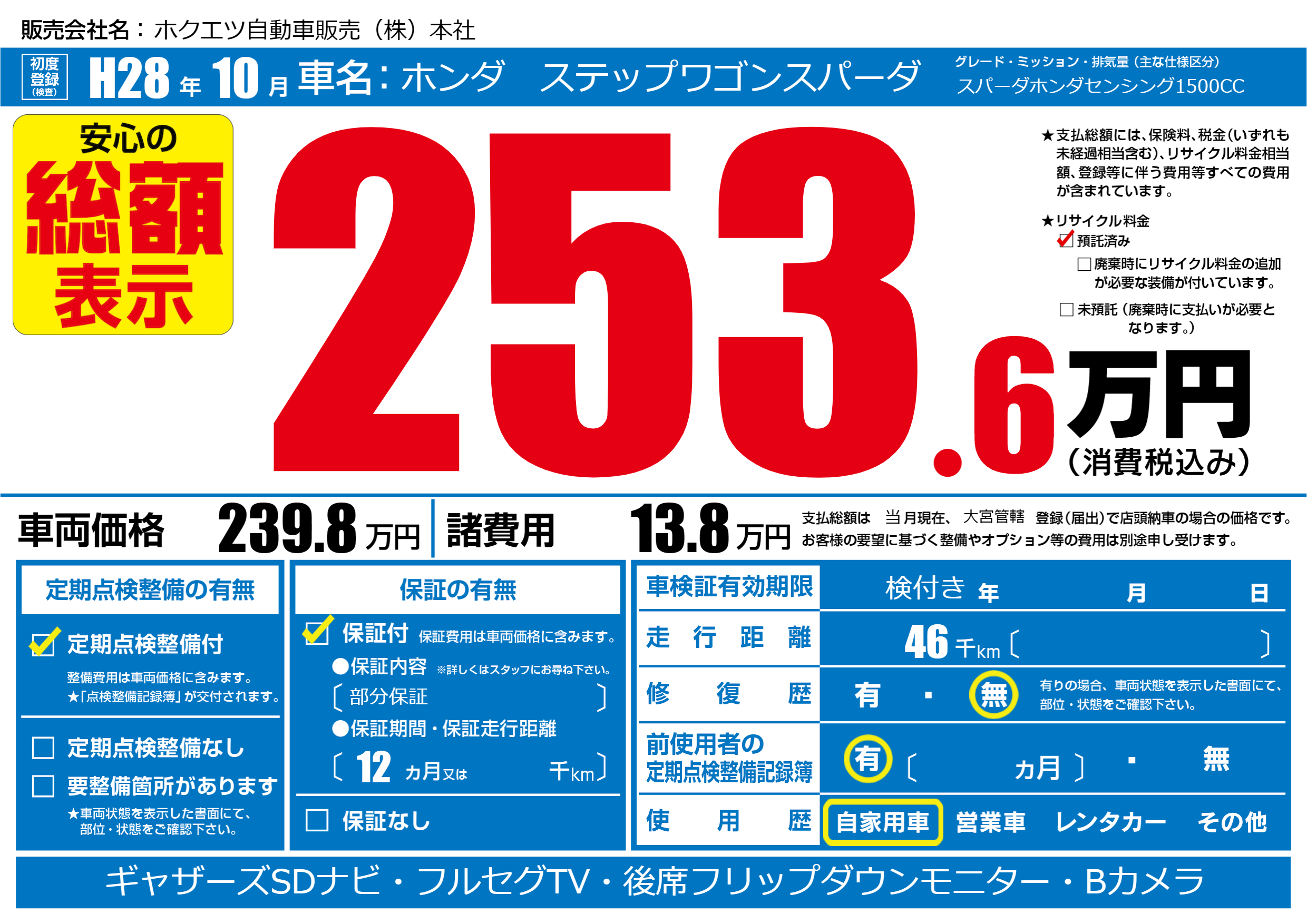 | 車名 | ホンダ ステップワゴンスパーダ | グレード ミッション 排気量 |