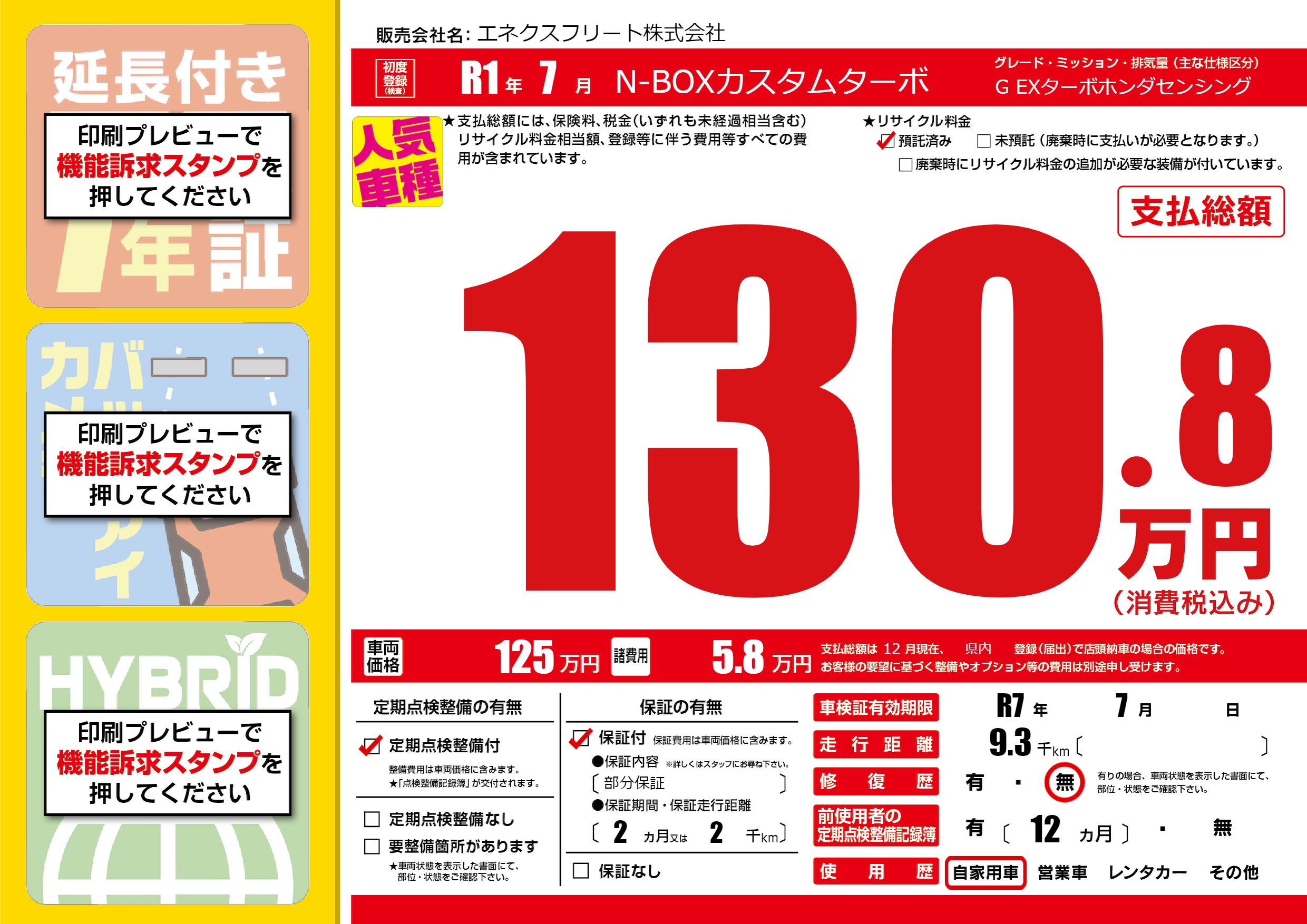 | 車名 | N-BOXカスタムターボ | グレード ミッション 排気量 |