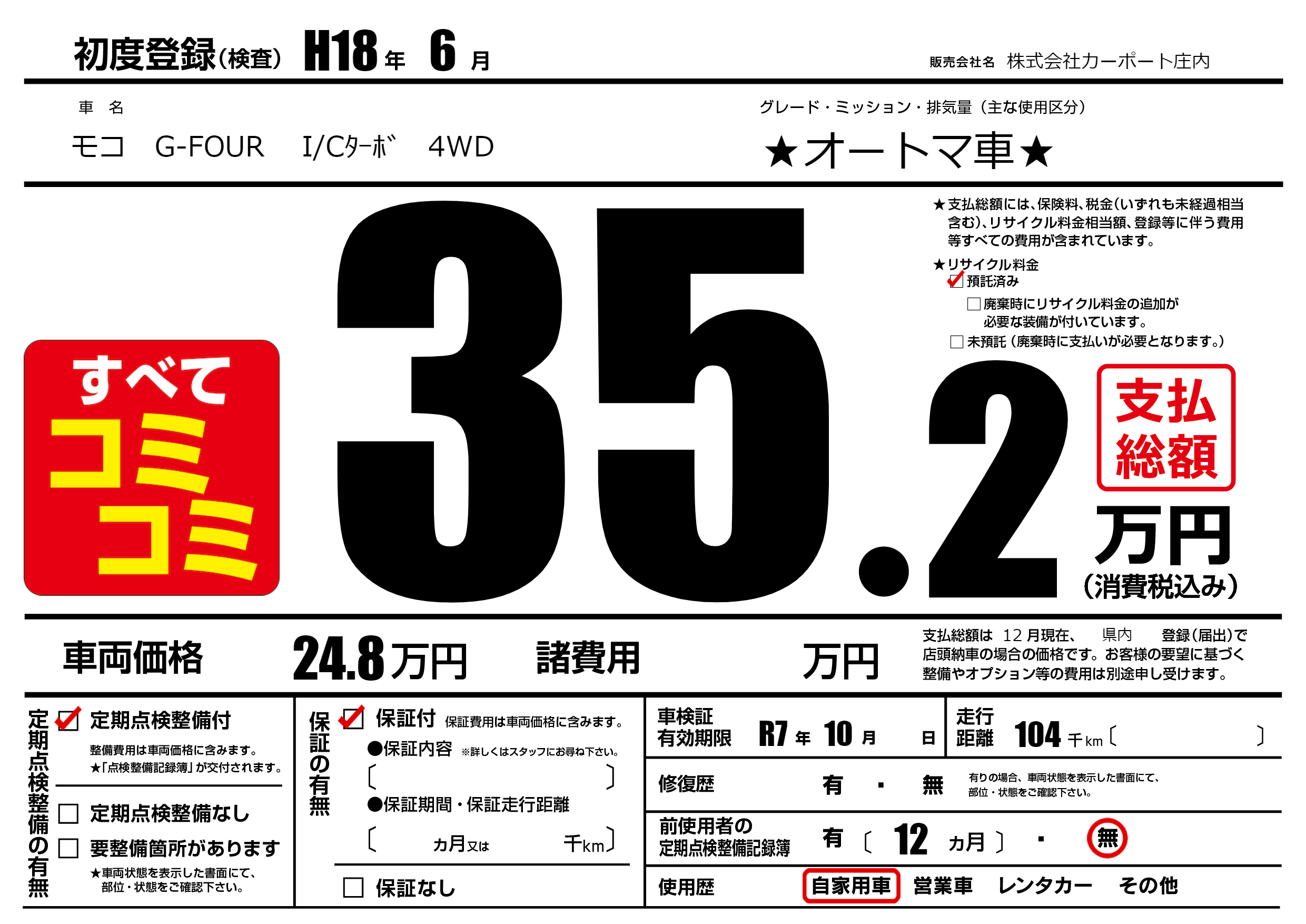 | 車名 | モコ G-FOUR I/Cターボ 4WD | グレード ミッション 排気量 |
