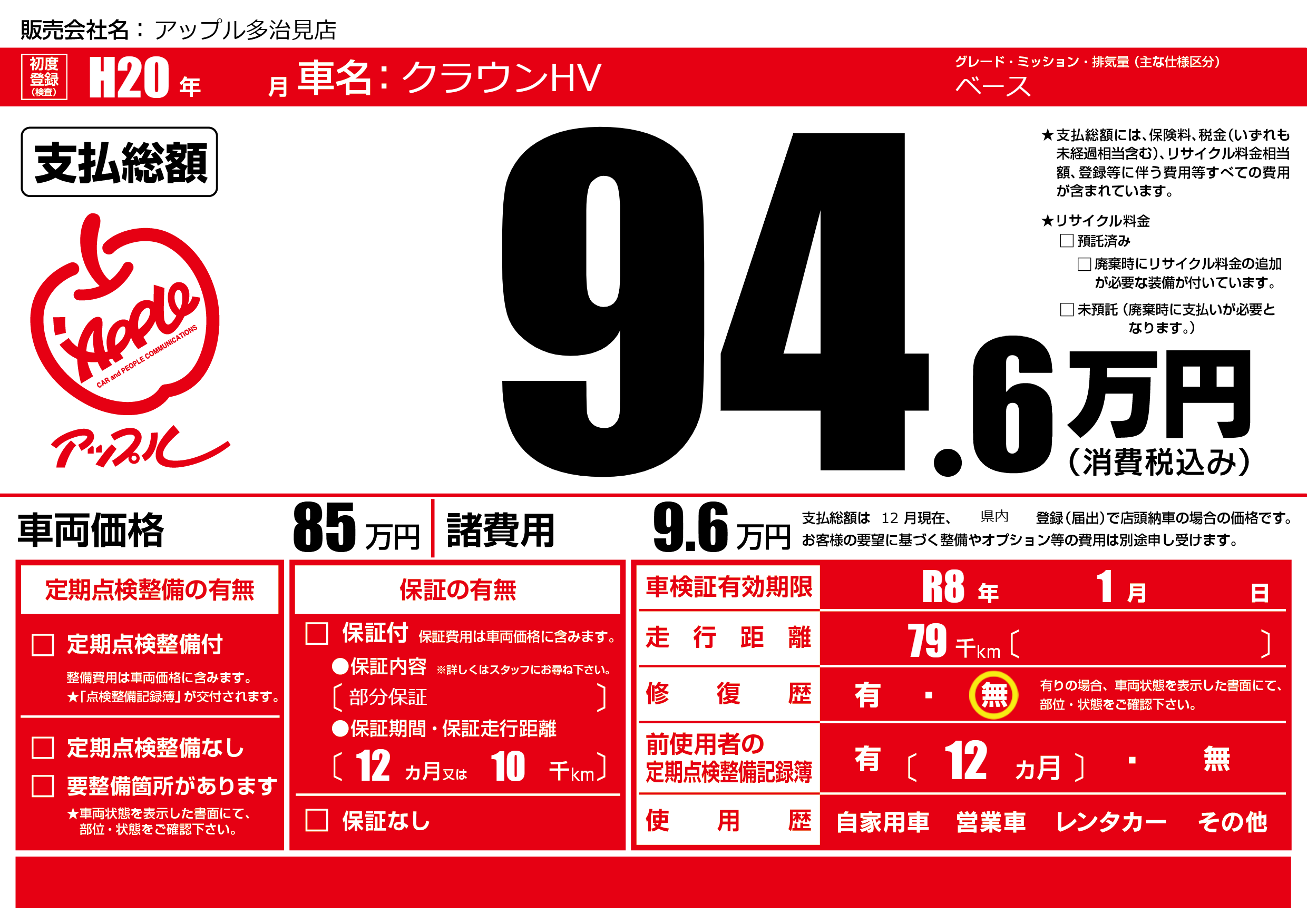 | 車名 | クラウンHV | グレード ミッション 排気量 |