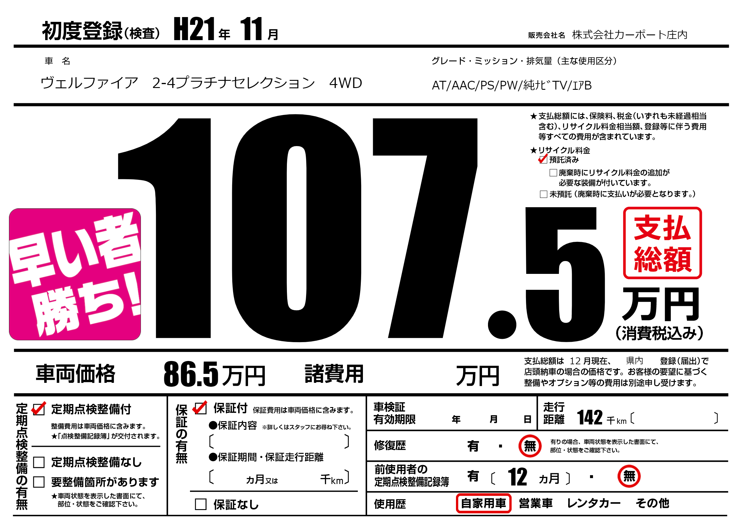 | 車名 | ヴェルファイア 2-4プラチナセレクション 4WD | グレード ミッション 排気量 |