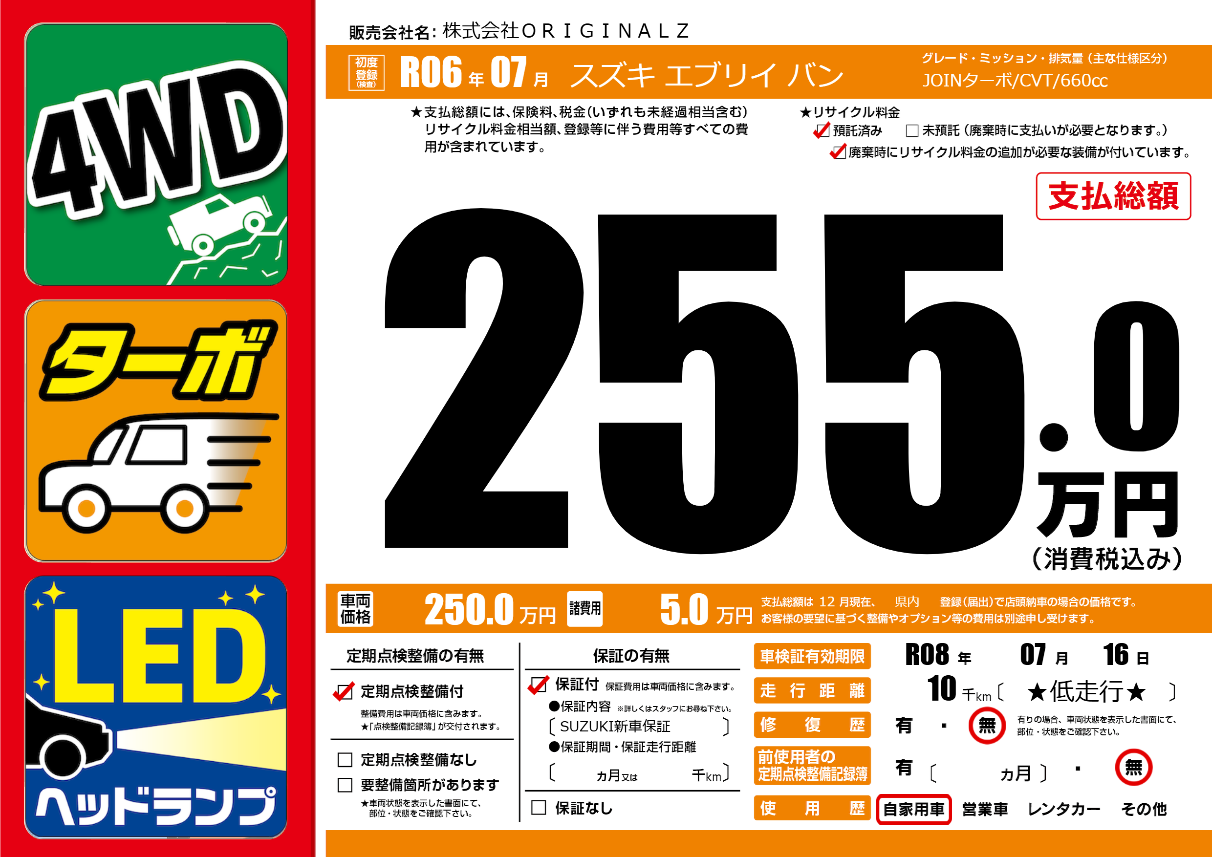 | 走行キロ | 1万km | 初年度登録 | R06年07月 |
