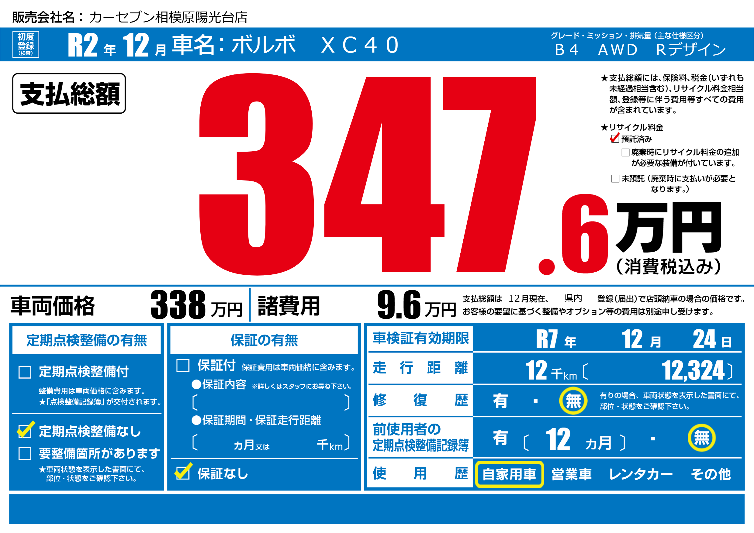 | 車名 | ボルボ XC40 | グレード ミッション 排気量 |