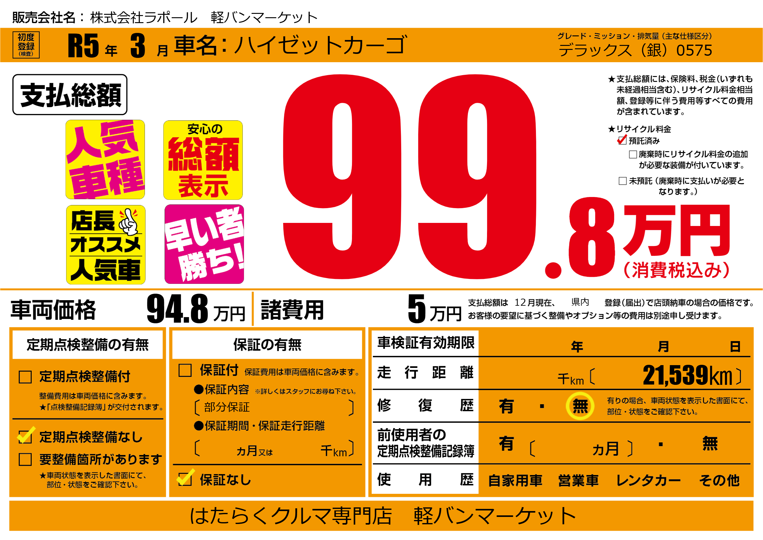 | 車名 | ハイゼットカーゴ | グレード ミッション 排気量 |