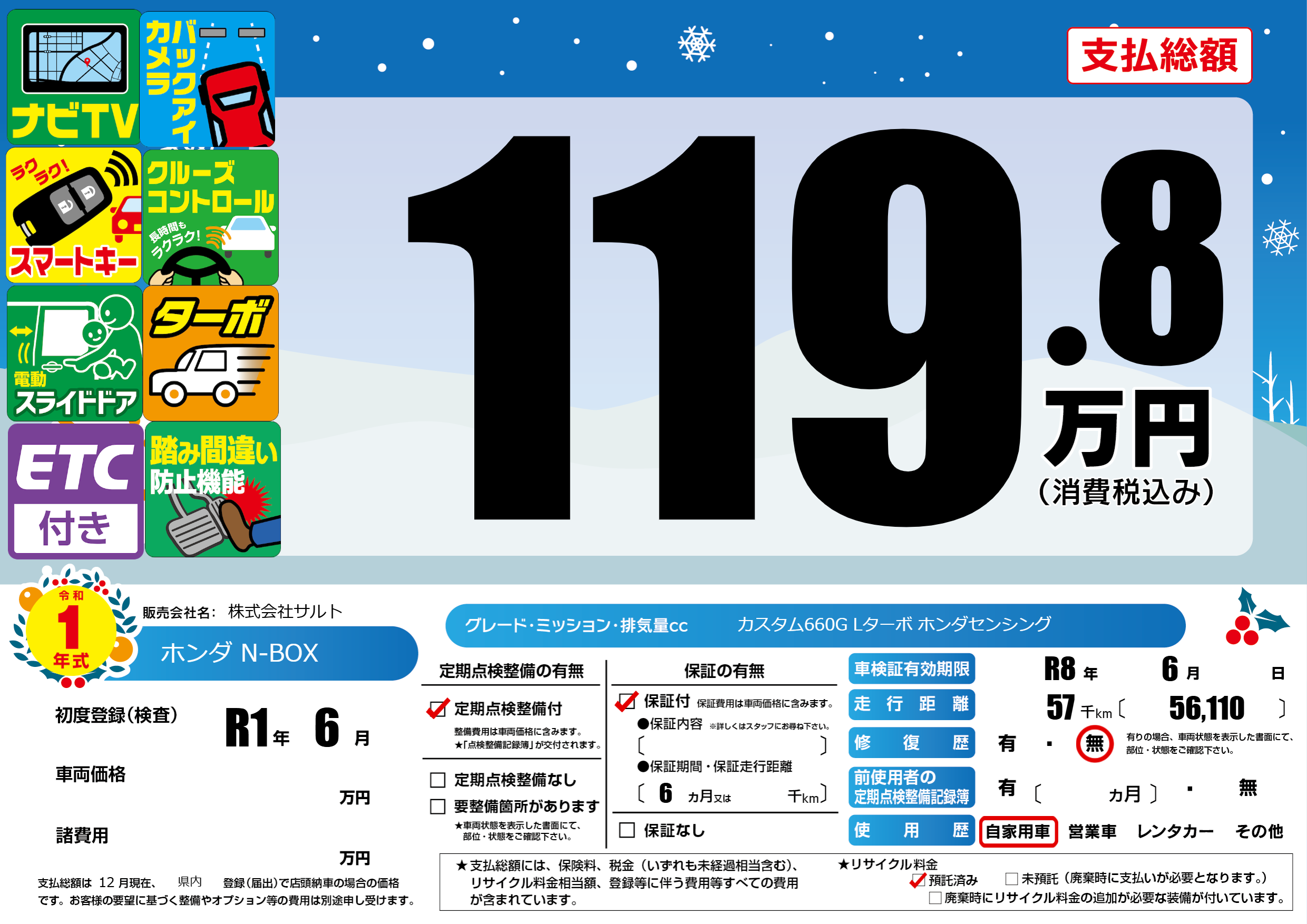 | 車名 | ホンダ N-BOX | グレード ミッション 排気量 |