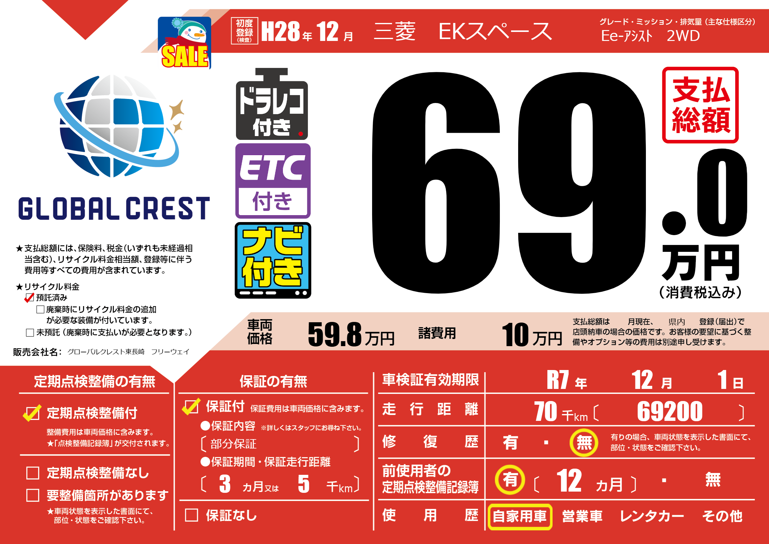 | 走行キロ | 7万km | 初年度登録 | H28年12月 |