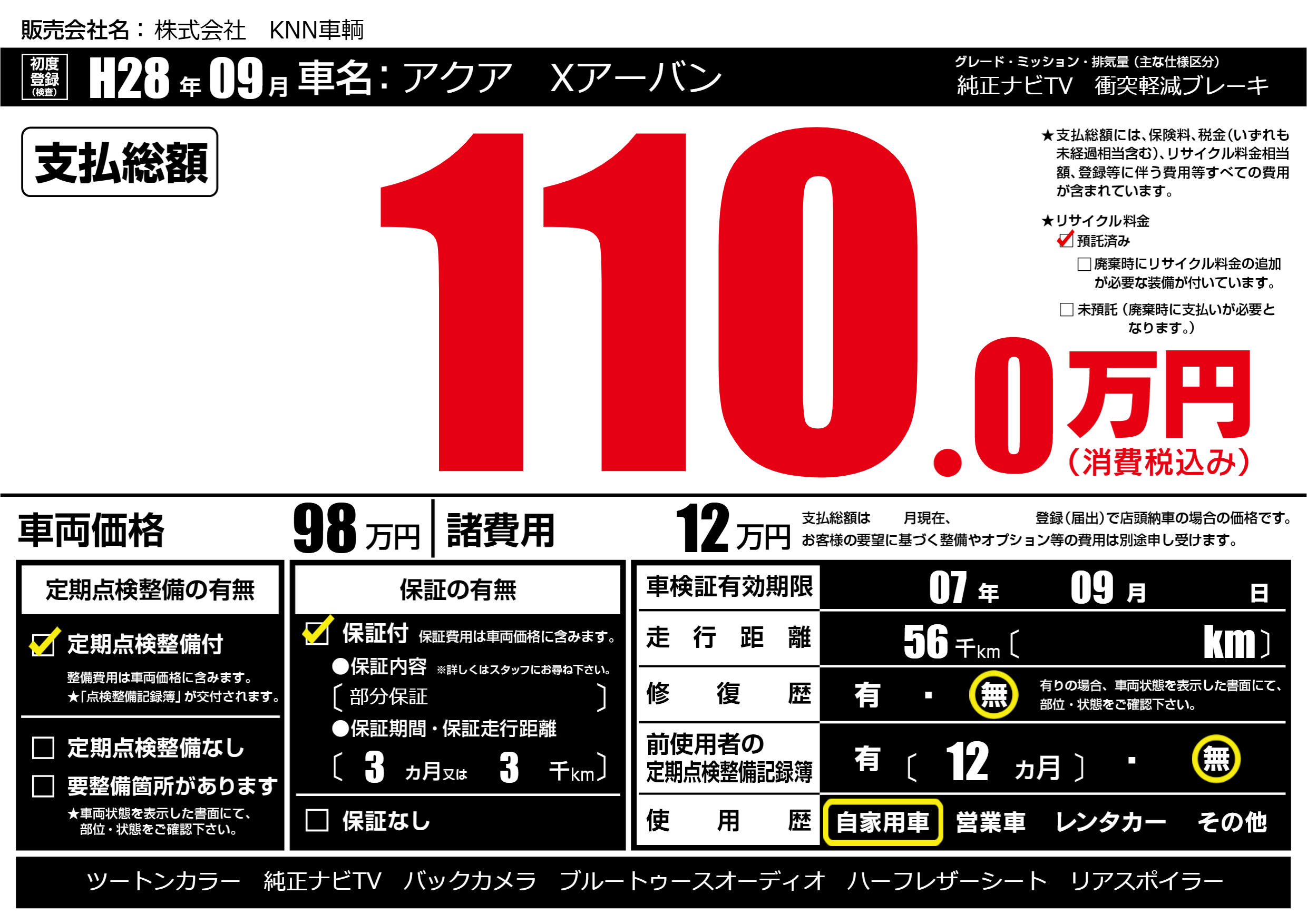 | 走行キロ | 5.6万km | 初年度登録 | H28年09月 |