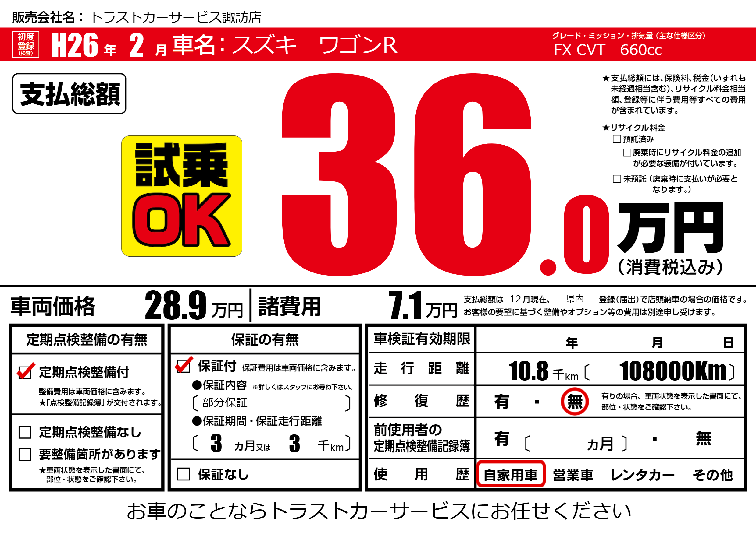 | 走行キロ | 1万km | 初年度登録 | H26年2月 |